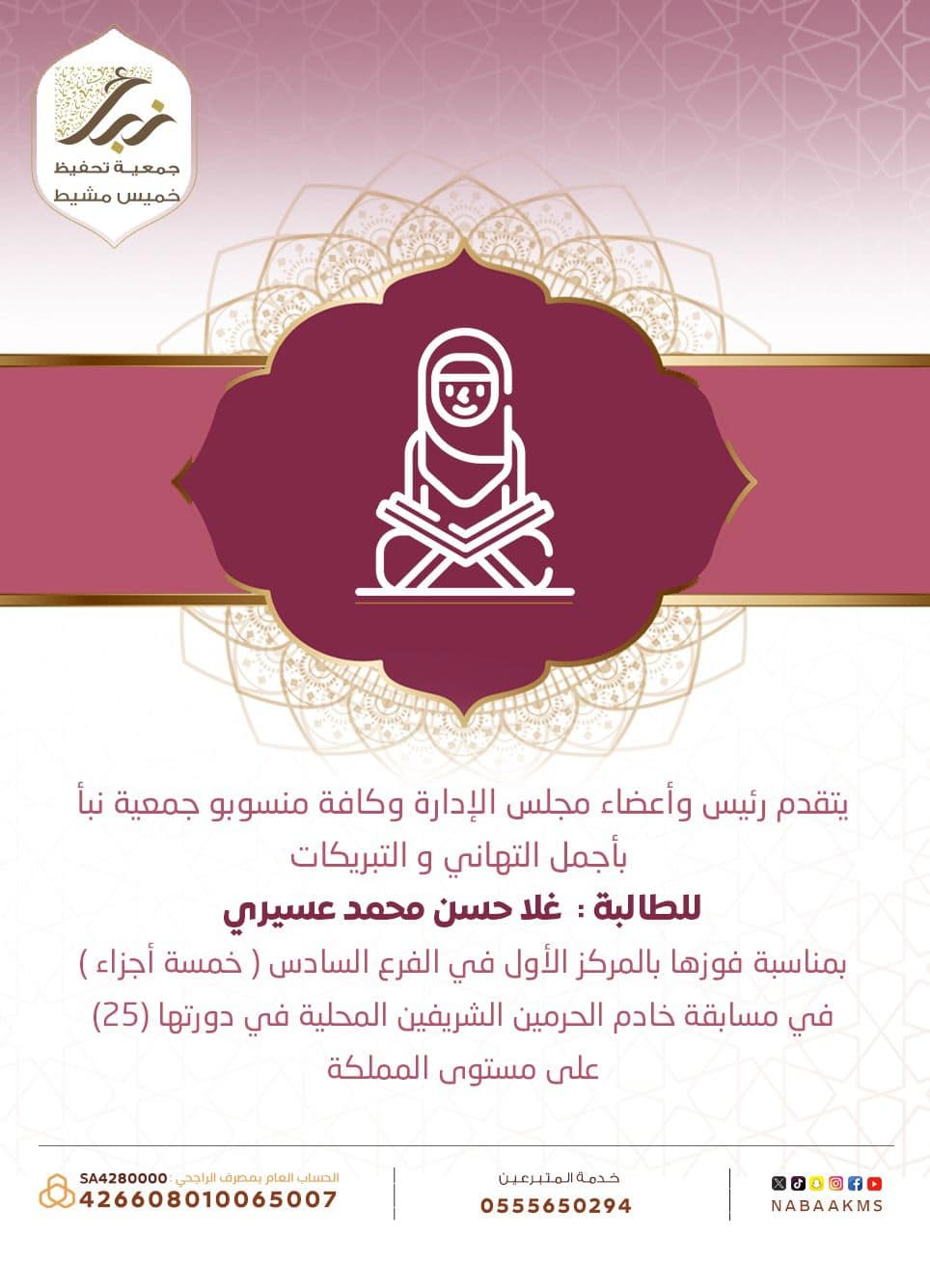 استمراراً لتميز طلاب حلقات جمعية نبأ في منافساتهم في المسابقات المحلية فاز الطالب ريان بن سعد الزهراني ( أحد طلاب برنامج التميز ) بالمركز الرابع في الفرع الثالث ( القرآن كاملاً ) بمسابقة خادم الحرمين الملك سلمان بن عبدالعزيز حفظه الله في دورتها (25) على مستوى المملكة