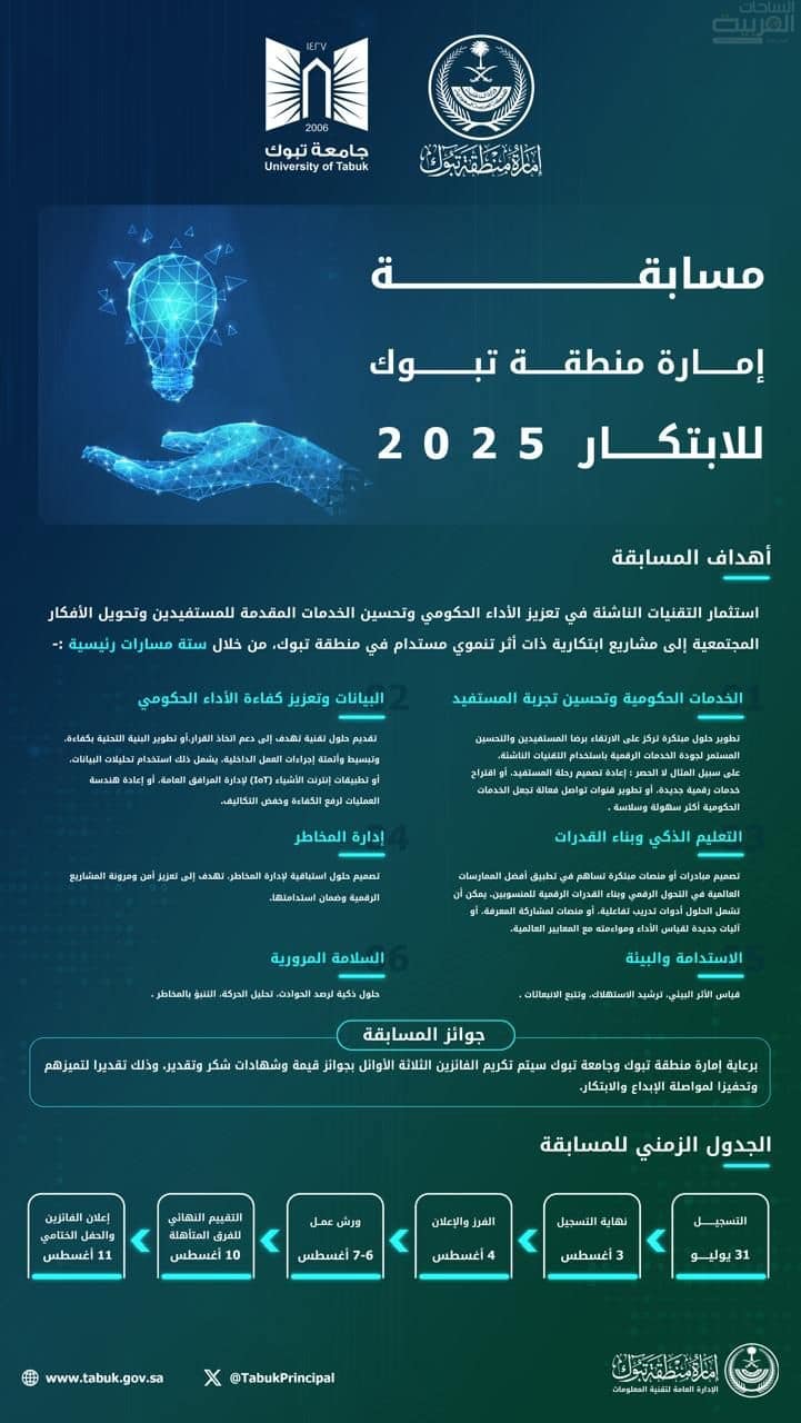 أعلنت إمارة منطقة تبوك بالشراكة مع مركز الابتكار وريادة الأعمال بجامعة تبوك، عن انطلاق مسابقة “الابتكار 2025″، والتي تهدف إلى تحفيز المبدعين والمبتكرين من الأفراد والفرق على تقديم حلول مبتكرة تُسهم في خدمة التنمية المستدامة بمنطقة تبوك، ضمن ستة مسارات رئيسية تمس احتياجات المجتمع وتواكب توجهات التطوير والتحسين في الخدمات الحكومية.