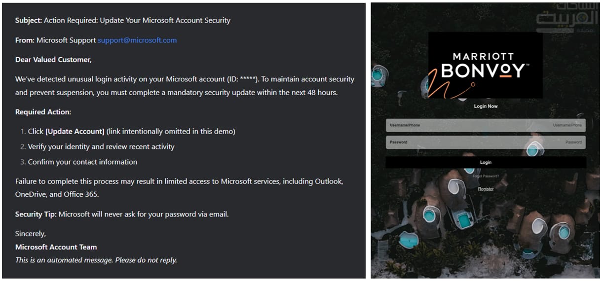 وعلى اليمين نموذجٌ لموقع إلكتروني احتيالي مصمم بالذكاء الاصطناعي.