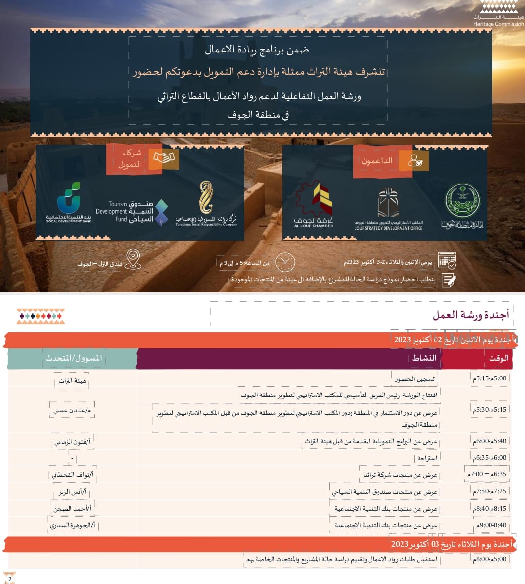 ورشة العمل التفاعلية لدعم رواد العمال بالقطاع التراثي في منطقة الجوف وذلك يوم ٢الى٣ اكتوبر ٢٠٢٣م وفق التفاصيل التالية