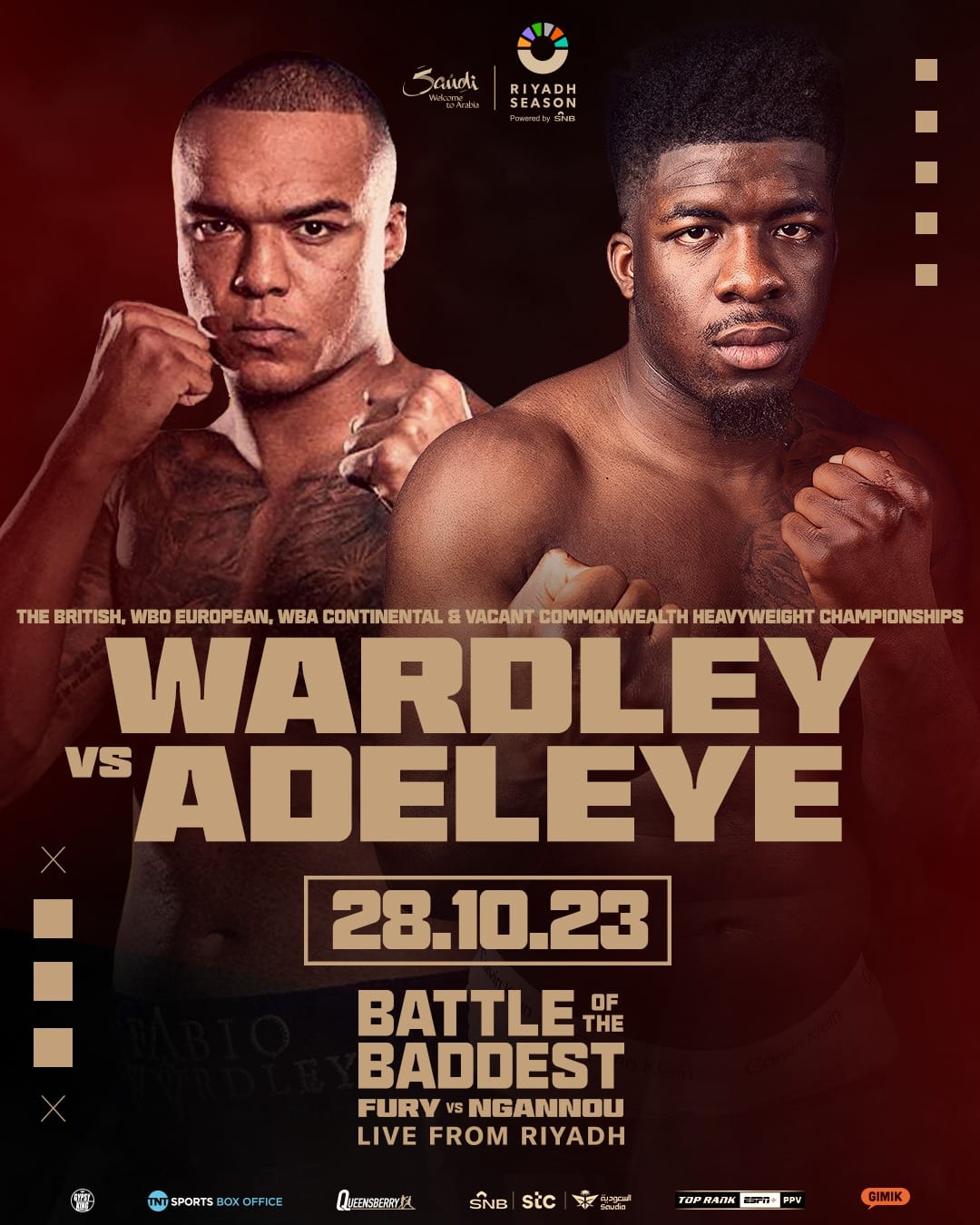 يسرنا أن نعلن لكم عن تأكيد نزال الملاكمة للوزن الثقيل بين الملاكم فابيو واردلي وديفيد اديلي التي تستضيفها العاصمة السعودية، الرياض، يوم 28 أكتوبر، والتي يدافع فيها واردلي عن لقبه في بطولة بريطانيا للملاكمة في الوزن الثقيل. وسيتولى مجلس مراقبة الملاكمة البريطاني (BBoC) تنظيم الحدث من البداية إلى النهاية.