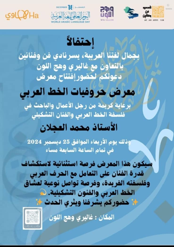 يستعد نادي فن وفنانين بالتعاون مع غاليري وهج اللون لافتتاح معرض حروفيات الخط العربي في أمسية فنية مميزة تُقام يوم الأربعاء 25 ديسمبر الجاري، في تمام الساعة السابعة مساءً.