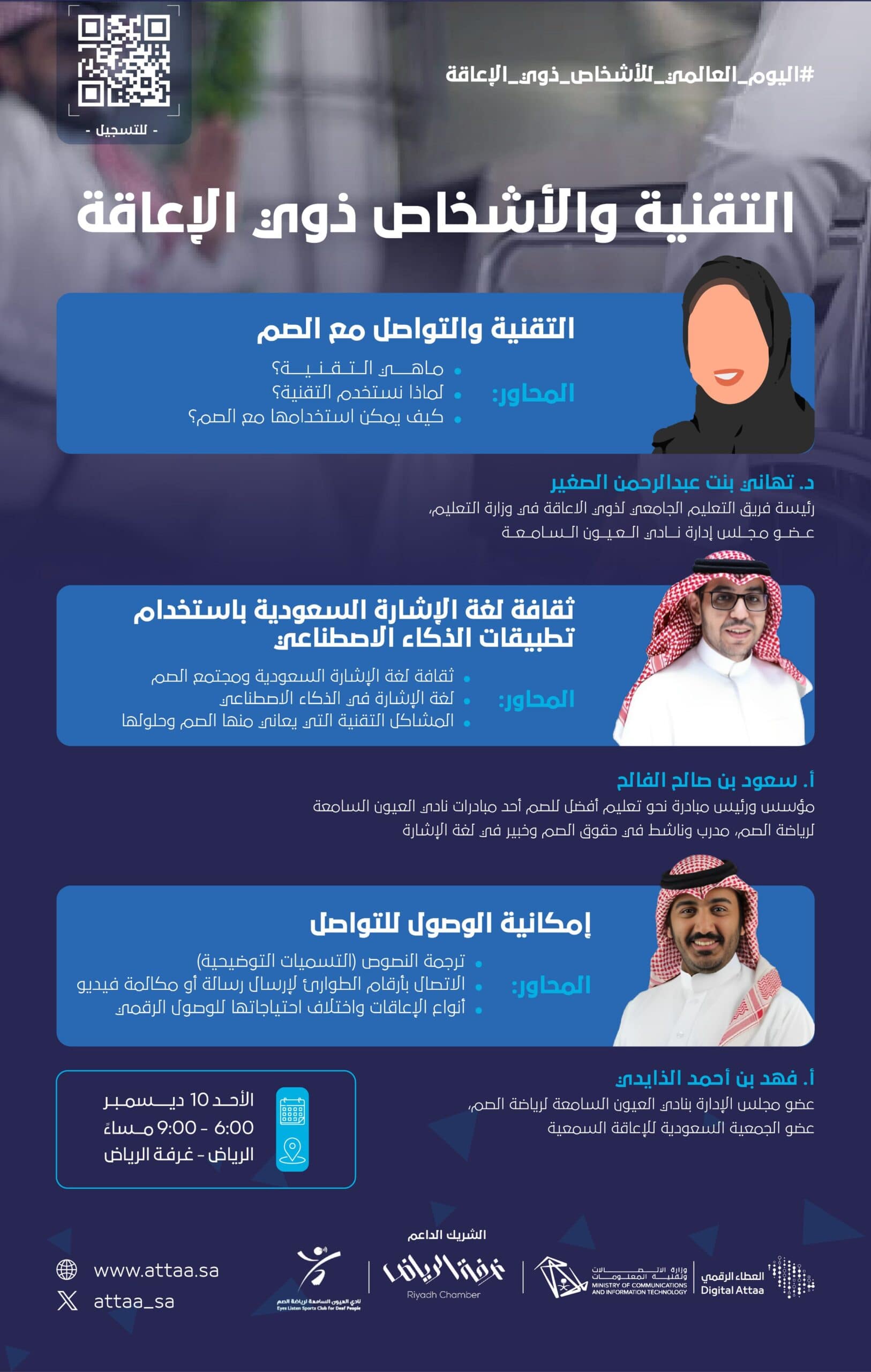 بمناسبة اليوم العالمي للاشخاص ذوي الاعاقة قدمت غرفة الرياض بالتعاون مع العيون السامعة لقاء بعنوان التقنية والاشخاص ذوي الاعاقة وذلك بالتعاون مع مبادرة العطاء الرقمي التابعة لو زارة الاتصالات وتقنية المعلومات