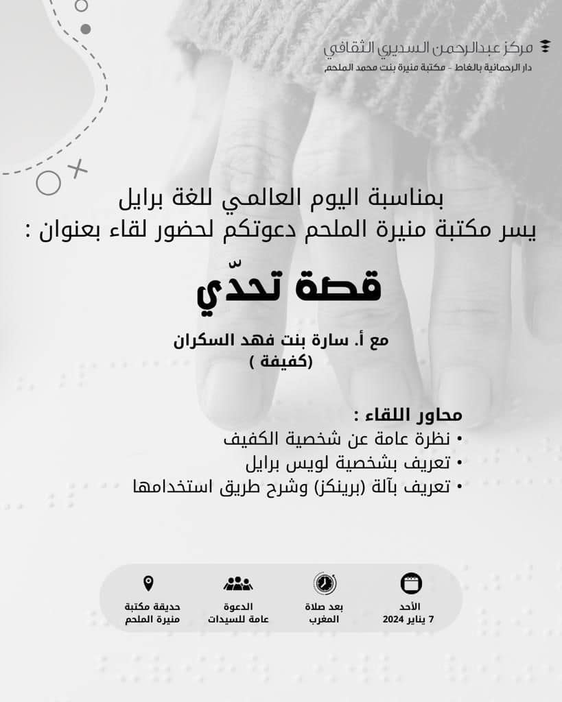 قدمت مكتبة منيره المحلم الدعوة لحضور لقاء بعنوان ( قصة تحدي ) تقدمه الاستاذه / سارة فهد السكران (كفيفه) في حديقة مكتبة منيره المحلم الدعوه عامة للنساء وستكون بعد صلاة المغرب اليوم الاحد الموافق ٧ يناير ٢٠٢٤