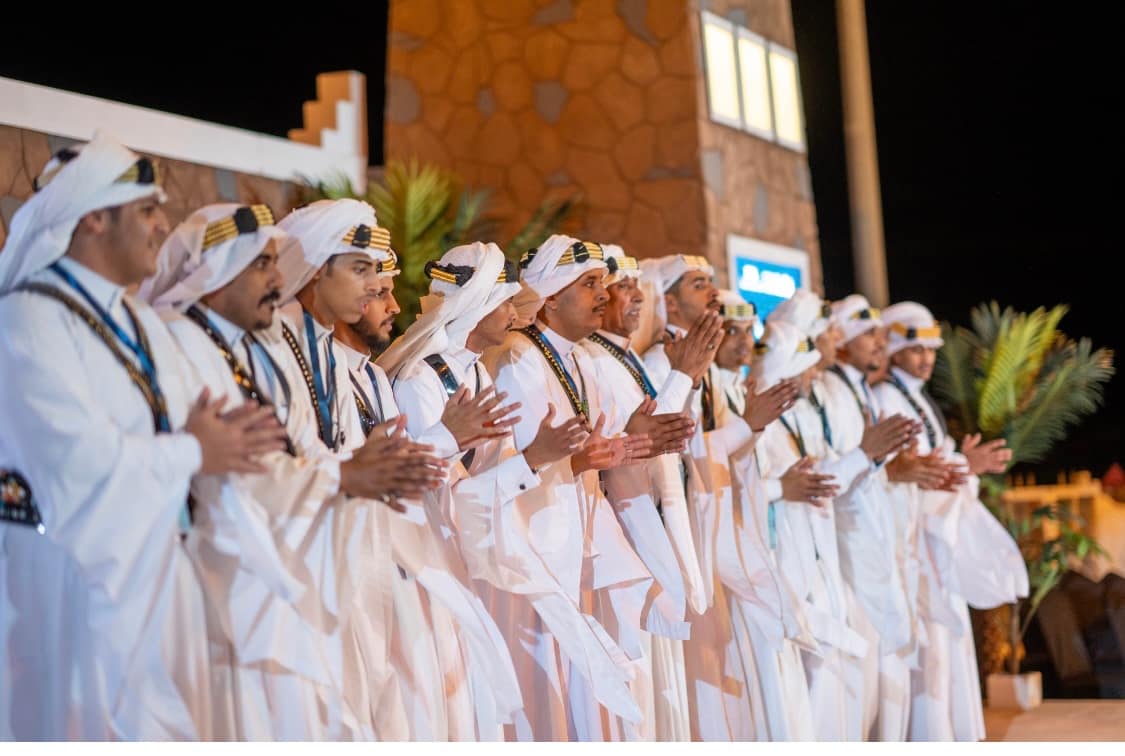 وبعدها قدّمت فرقة بني شهر من منطقة عسير “فن اللعب الشهري”، الذي يجمع بين الشعر والموسيقى والحركة الجماعية المتناسقة، بطريقةٍ فنية تعتمد على استخدام الطبل، وترديد اللحن المترافق مع حركة اليدين، ثم الإنحناء بحركة سريعة نحو الأرض ليقفوا مرة أخرى، مع تكرار هذا الأداء عدة مرات متتالية وبانسجامٍ لافت.