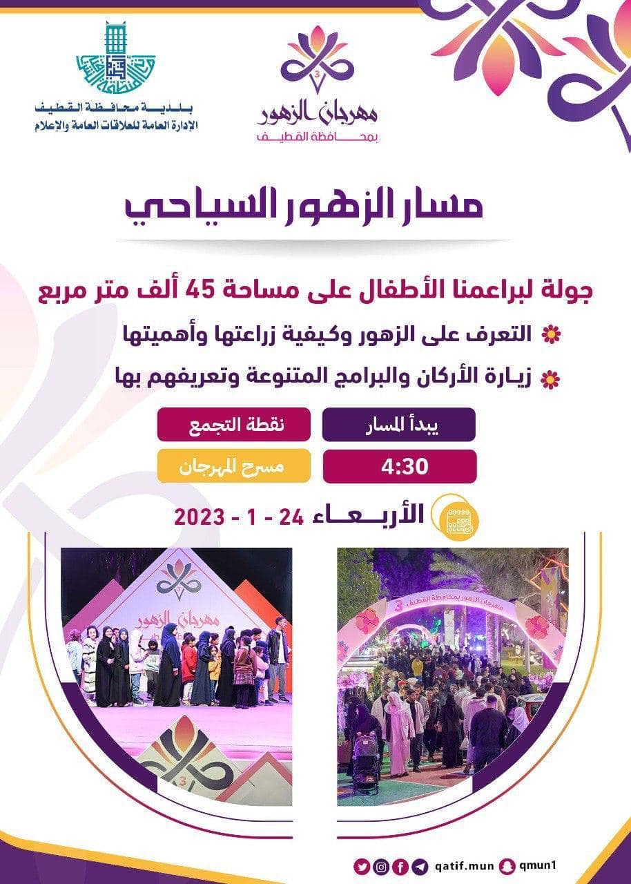 ضمن برامج مهرجان الزهور الثالث تنظم بلدية محافظة القطيف اليوم الأربعاء الموافق ٢٤ يناير ٢٠٢٤م في منتزه سيهات تنطلق في 4:30 مساء مبادرة “مسار الزهور السياحي” للأطفال على مساحة 45 ألف متر مربع.