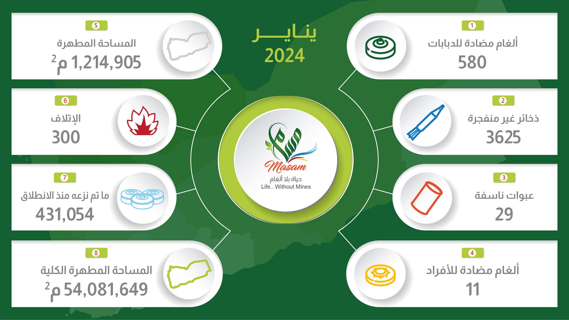 وفي هذا الإطار أصدر المركز الإعلامي لمشروع «مسام» لنزع الألغام في اليمن تقريره الشهري، عن شهر يناير 2024م، حيث بين هذا التقرير أن إجمالي ما تم نزعه في هذا الشهر، 4245 لغماً وقذيفة غير منفجرة وعبوة ناسفة.
