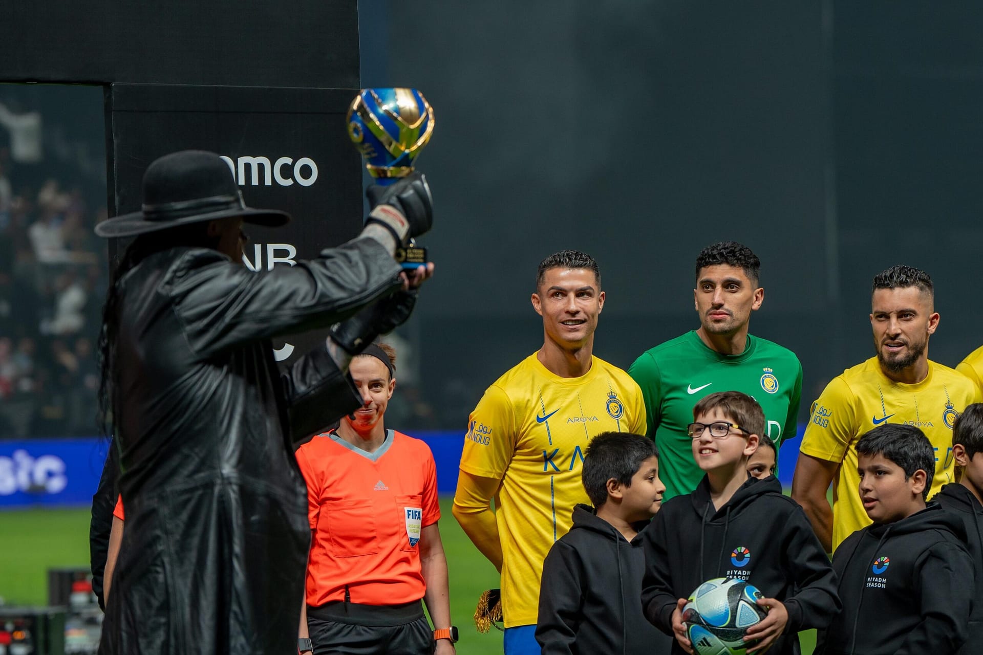 واستبقت المباراة بحفل افتتاح بهيج شهد حضور فرقة ميامي وألوانا من الإضاءات النارية وتشكيلات الليزر في أنحاء الملعب الذي ضجت أركانه بهتافات الجماهير تزامنا مع نزول المصارع العالمي الشهير اندرتيكر في ممر مخصص له وسط الملعب؛ ليسدل الستار عن كأس البطولة الذي يحمل اسم وشعار الموسم.