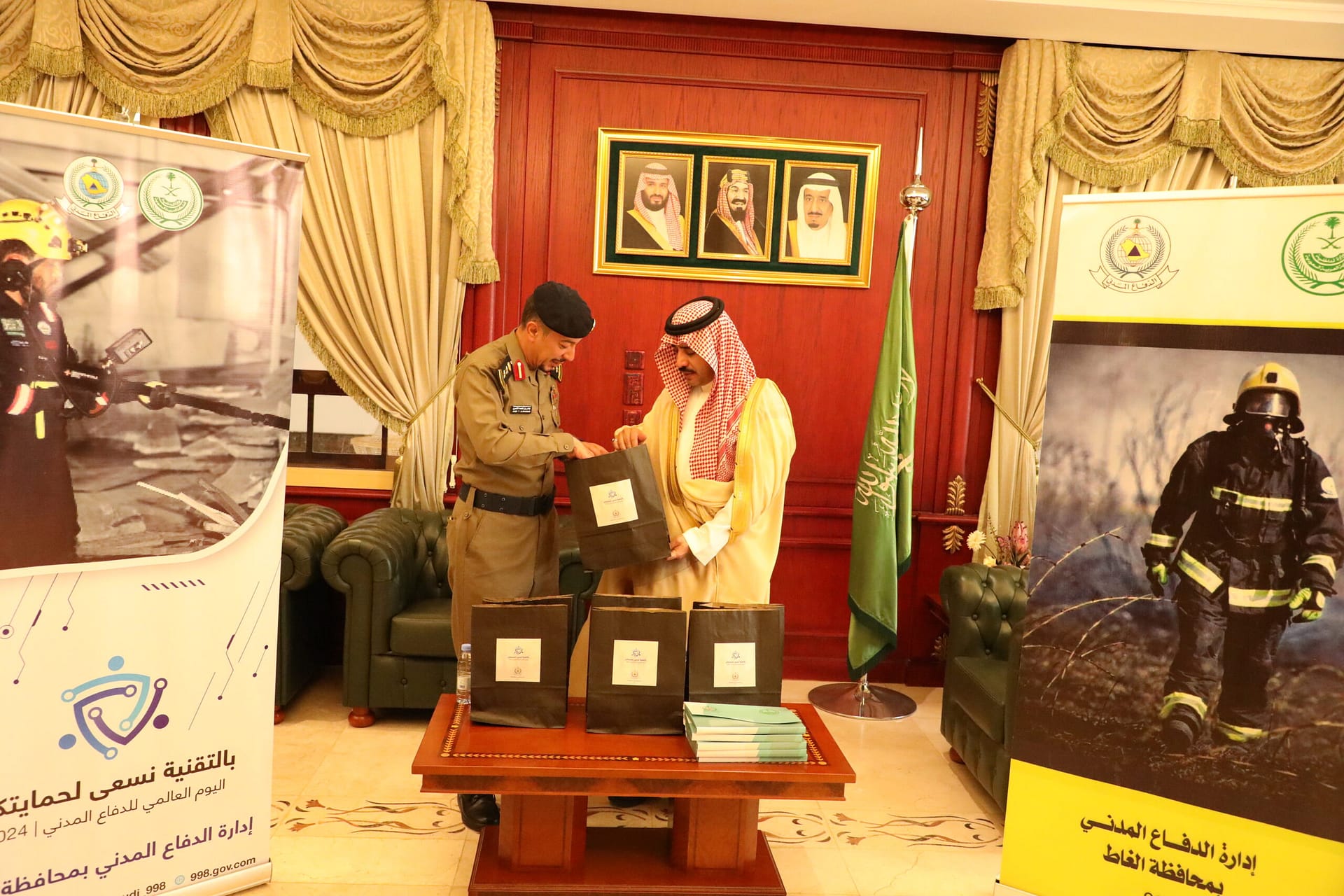 دشن سعادة محافظ محافظة الغاط الاستاذ/ منصور بن سعد السديري بحضور العقيد / جاسر بن طعمهالشمري مدير ادارة الدفاع المدني بمحافظة الغاط صباح هذا اليوم الاحد الموافق …….. فعاليات اليومالعالمي للدفاع المدني ببالمحافظه بعنوان ( بالتقنيه نسعى لحمايتكم).