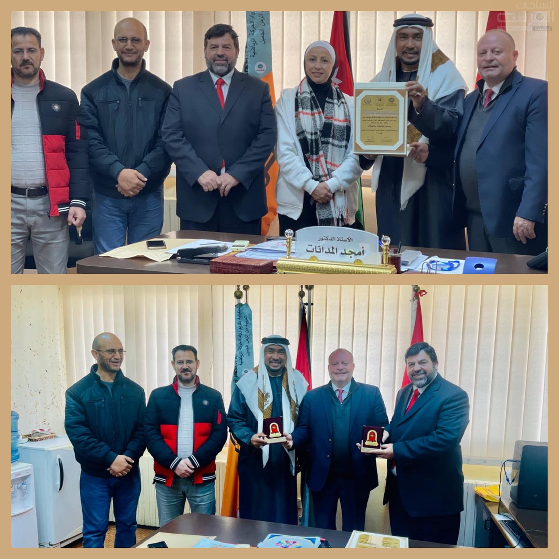 تشرف الأستاذ حسين يسلم بن سميد عضو شرف الهيئة العالمية لتبادل المعرفة بزيارة جامعة مؤتة في جنوب الأردن بمحافظة الكرك، والتي تبعد 150 كم من العاصمة عمان بمعية الأخ الأستاذ الدكتور عبدالباسط الشرمان، وكان في استقبالنا عميد كلية علوم الرياضة في الجامعة الأستاذ الدكتور أمجد مدانات ونائب العميد الدكتور معن الشعلان ورئيس قسم التأهيل الرياضي الدكتور مهند الزغيلات وجمع غفير من الطلبة وأساتذة الكلية، وقد حضر مناقشة رسالة ماجستير في الكلية وبدعوة من العميد لتناول المنسف الأردني الأصلي باللحم البلدي والجميد الكركي والكنافة الأردنية اللذيذة بصحبة أساتذة كلية علوم الرياضة وبهذه المناسبة تقدم الأستاذ حسين يسلم بن سميد عضو شرف الهيئة العالمية لتبادل المعرفة بتكريم عميد الكلية بدرع الهيئة العالمية لتبادل المعرفة، وقام العميد بدوره بتكريم عضو الشرف بدرع جامعة مؤتة، وقد استمتعت جدا بهذه الزيارة الكريمة، وأدعو أن يحفظ الأمن والاستقرار في الأردن الشقيق بلد النشامى والرجال.
