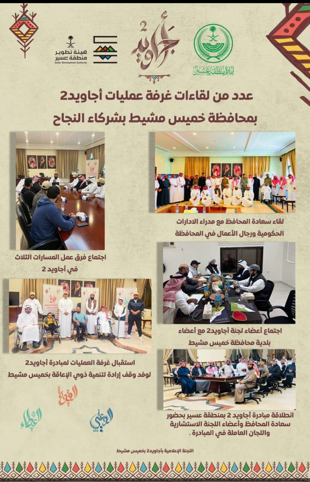 وفي هذا الاطر أقامت غرفت عمليات أجاويد 2 لقاءات مكثفه حيث قام سعادة محافظ خميس مشيط الاستاذ خالد ال مشيط لقاءات مع المدراء الإدارات الحكوميه ورجال الأعمال في المحافظه