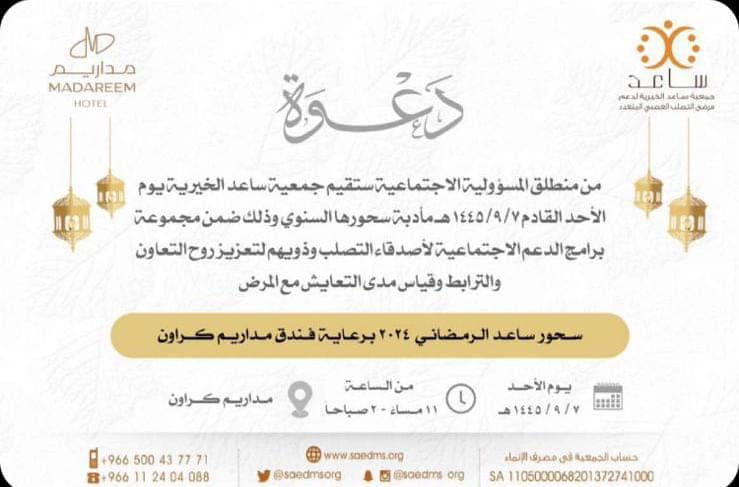 اقامت جمعية ساعد الخيريه سحورها السنوي وذلك ضمن برامج الدعم الاجتماعيه لأصدقاء التصلب وذويهم لتزداد روح التعاون وقياس مدى التعايش مع المرض بحضور عدد من الشخصيات من اعلامييين ونخبه من الدكاتره والصحفيين وعدد من المرضى وذويهم.
