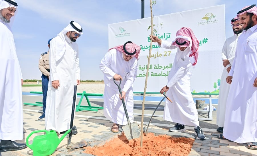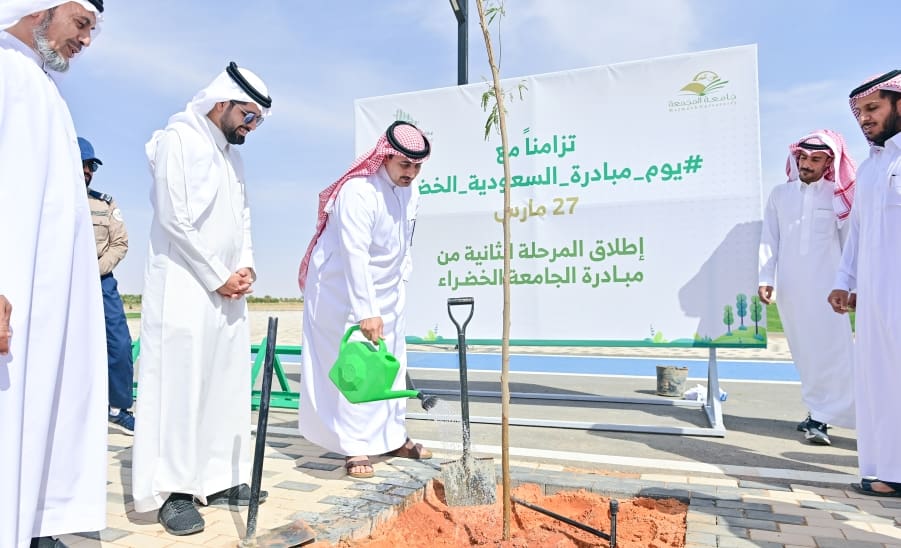 دشن سعادة رئيس جامعة المجمعة الأستاذ الدكتور صالح بن عبدالله المزعل المرحلة الثانية من مبادرة الجامعة الخضراء ، وذلك بالتزامن مع مبادرة السعودية الخضراء، بحضور وكلاء الجامعة ، وعدد من مدراء الإدارات ، وعمداء الكليات والعمادات المساندة.