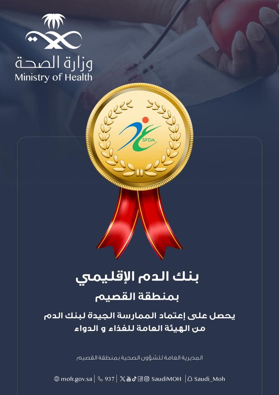 و يعد بنك الدم الإقليمي المرجع الفني و الإداري لبنوك الدم الفرعية بالمنطقة و ما تحقق لبنك الدم إنجازاً يعتبر الأول من نوعه من حيث سرعة الاعتماد للمنشأة، ويأتي هذا ضمن النجاحات التي تتحقق لصحة القصيم والخدمات الصحية المقدمة بالمنطقة