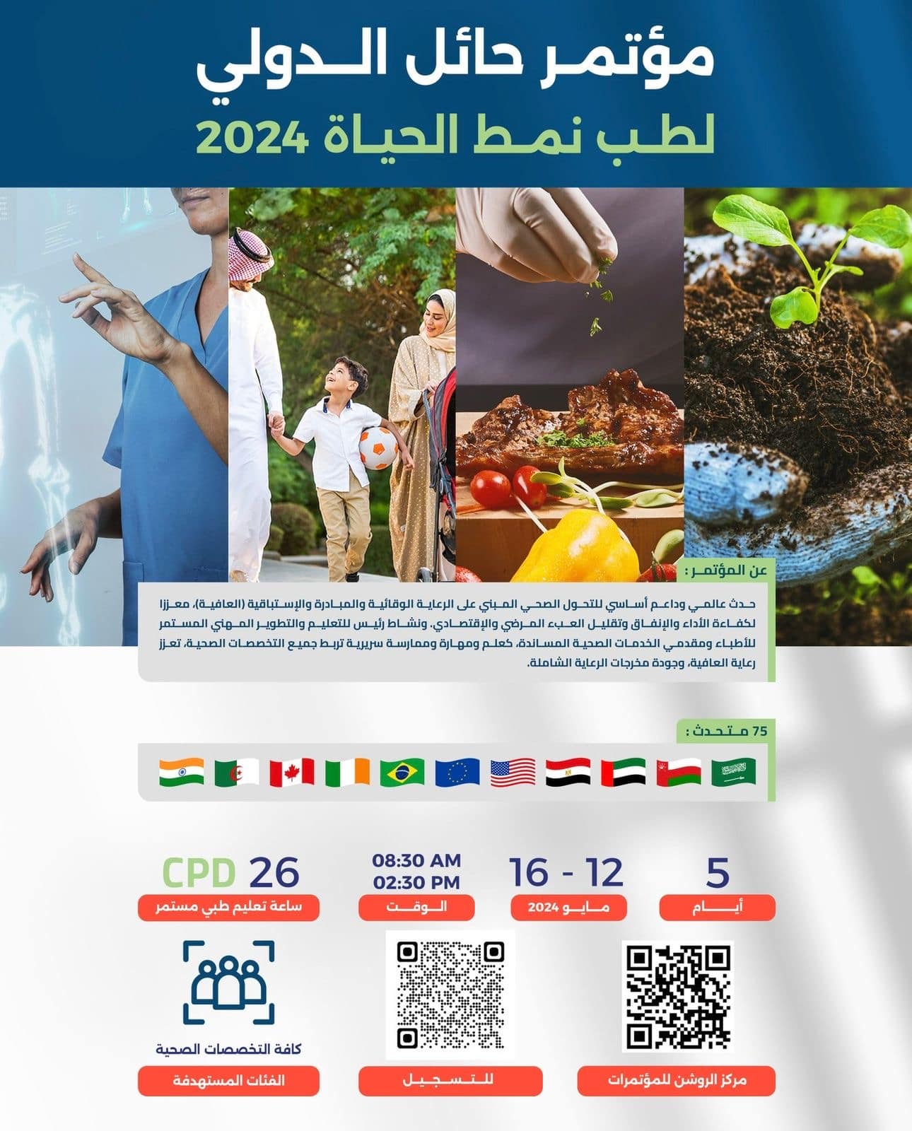 وأوضح مدير عام الشؤون الصحية بمنطقة حائل سلطان بن ناصر المسيعيد، أن المؤتمر يشارك فيه أكثر من 75 متحدثاً من دول العالم من العلماء والخبراء والمتخصصين في طب نمط الحياة من دول أمريكا والاتحاد الأوروبي وكندا والبرازيل والعديد من الدول العربية، ومن المملكة العربية السعودية، بدعم من معالي وزير الصحة.