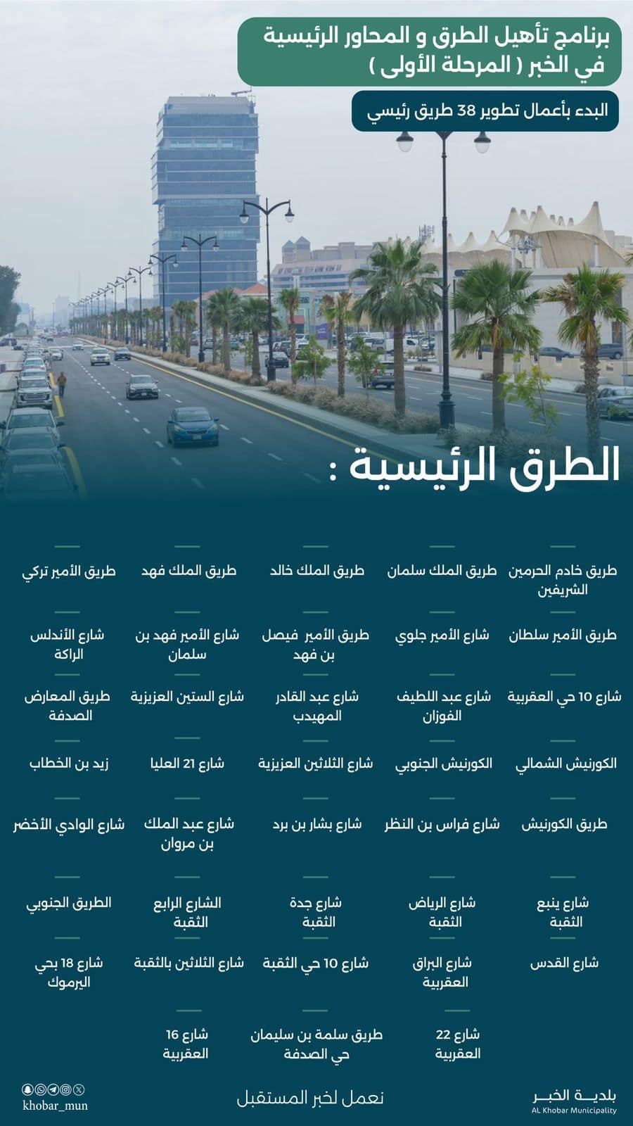 وتشمل الأعمال في الطرق اعادة التطوير والسفلتة , وأعمال التشجير والزراعة، وتحسين التقاطعات، والانارة والأرصفة, فيما تواصل البلدية العمل على الدراسات والتصاميم للمشاريع المستقبلية للمرحلة الثانية من تطوير المحاور الرئيسية و التي تسعى من خلالها للارتقاء بشبكة الطرق في مدينة الخبر.)