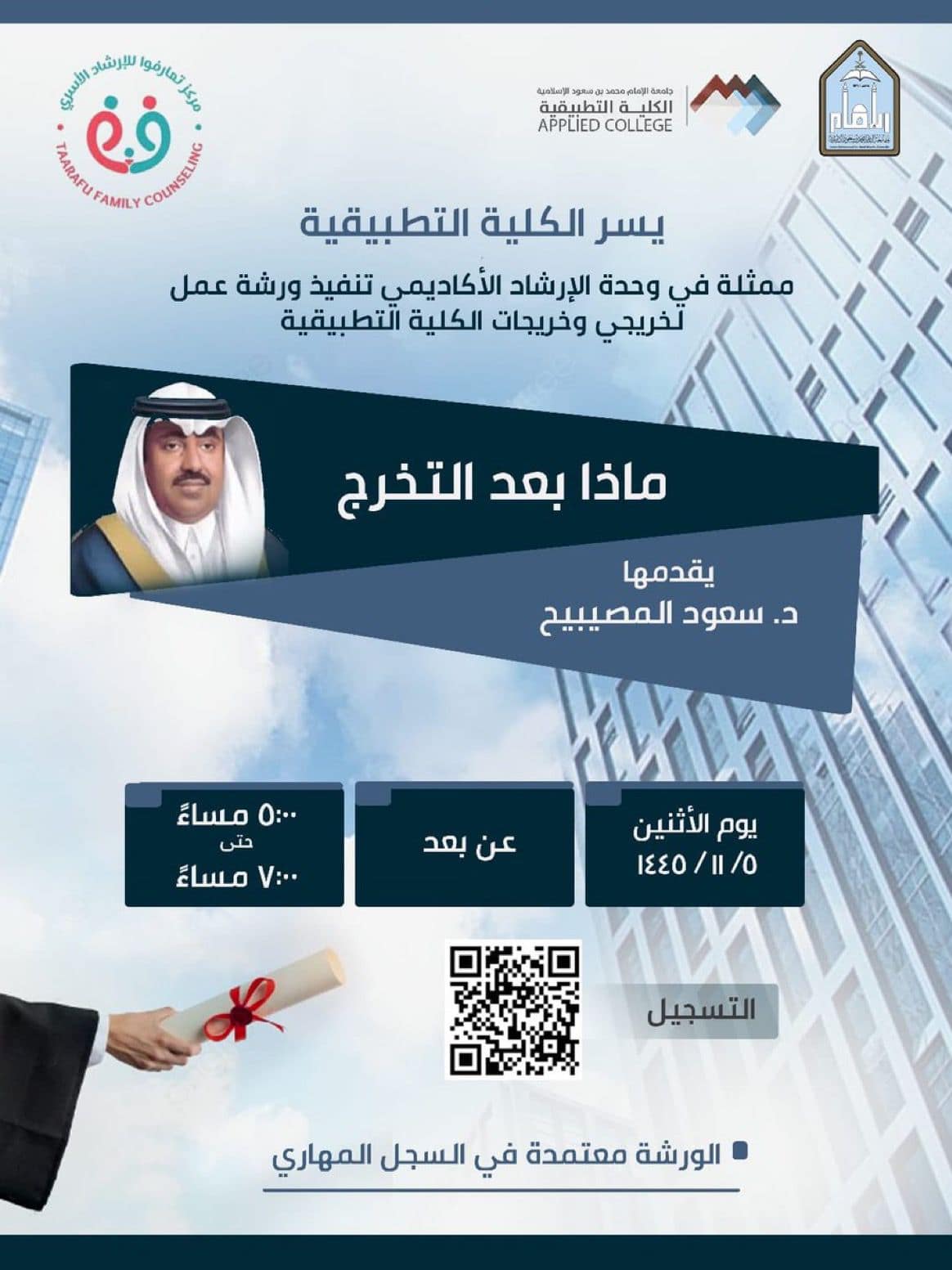 نظمت الكلية التطبيقية بجامعة الإمام محمد بن سعود الإسلامية محاضرة بعنوان : ماذا بعد التخرج وذلك بالتعاون مع مركز تعارفوا للإرشاد الأسري وذلك يوم الاثنين الموافق ١٤٤٥/١١/٥ هجري حيث حلّ الدكتور سعود بن صالح المصيبيح رئيس مركز تعارفوا للإرشاد الأسري ضيفاً لهذه المحاضرة والتي عُقدت بمنصة ( الزووم ) .