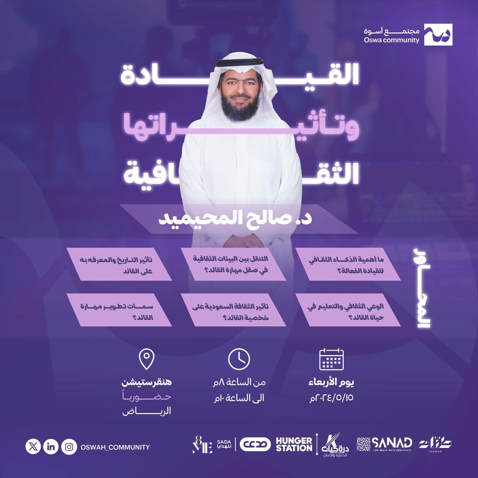 أُقيم مساء يوم الأربعاء الموافق 15\5\2024 في قاعة شركة هنقرستيشن، إحدى لقاءات مجتمع أسوة الدورية، التي تُعنى ببناء وتأهيل القيادات الشبابية لما فيه خدمة وطنهم، ومنحهم الفرص للاستماع لتجارب القيادات السابقة والتجاربة الشخصية.