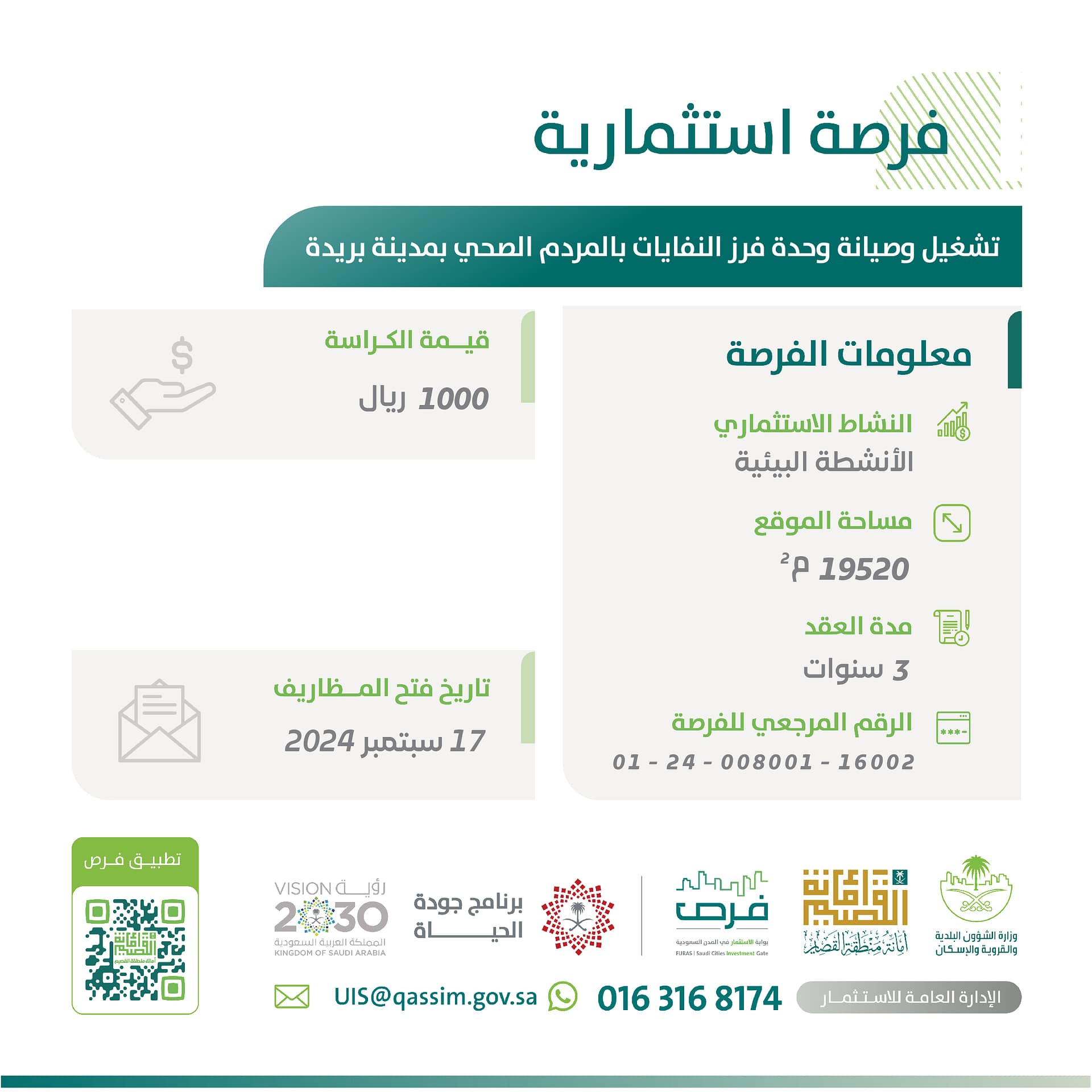طرحت أمانة منطقة القصيم ممثلة بالإدارة العامة للاستثمارات فرصة استثمارية أمام منشآت القطاع الخاص، في مجال الأنشطة البيئية عبر فرص، حيث تتمثل الفرصة في تشغيل وصيانة وحدة فرز النفايات بالمردم الصحي بمدينة بريدة، على مساحة 19520م 2، ومن المقرر أن يكون آخر موعد لشراء الكراسة وتاريخ فتح المظاريف يوم 17 سبتمبر 2024م، داعيةً المستثمرين الراغبين في التنافس الاطلاع على الفرصة، وتفاصيل المنافسة من خلال تطبيق الاستثمار البلدي (فرص)
