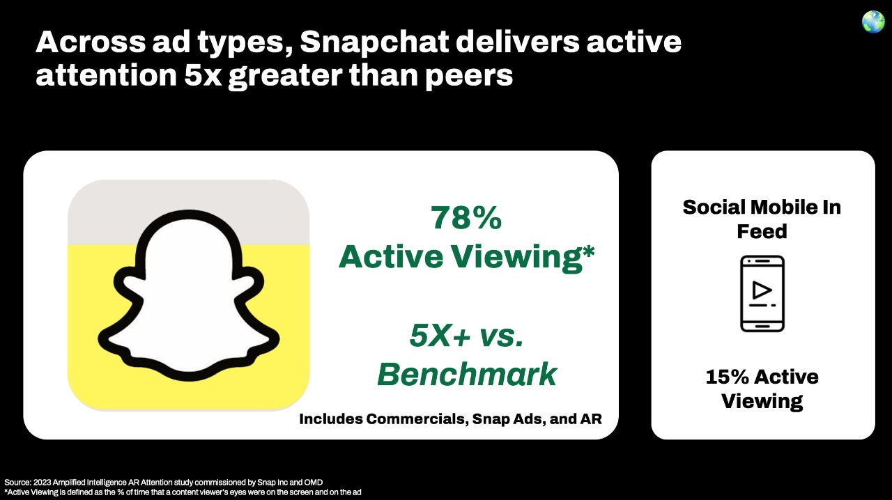 وتعمق التحليل في سلوك المشاهدة الآنية وبيانات استطلاعات الرأي، التي تم جمعها من المستخدمين الذين تم تحليل تفاعلهم، ليكشف عن مستويات الاهتمام الحقيقي الذي تحظى به كل عدسة وتأثيرها على الأداء الإبداعي، بما في ذلك قوة الإعلان على المدى القصير، وحضوره على المدى الطويل. وتتفوق سناب شات على غيرها من تطبيقات وسائل التواصل الاجتماعي من حيث استقطاب إعلاناتها للاهتمام أكثر بـ 5 مرات عبر جميع أنواع الإعلانات بما في ذلك التجارية وإعلانات سناب والواقع المعزز. وتتميز الحملات الإعلانية التي تستخدم الواقع المعزز في المملكة العربية السعودية بتكلفة أقل بثلاث مرات لكل شخص إضافي يتمكن الإعلان من الوصول إليه، مما يبرز فعالية وكفاءة هذه التقنية في قطاع التسويق والإعلان.
