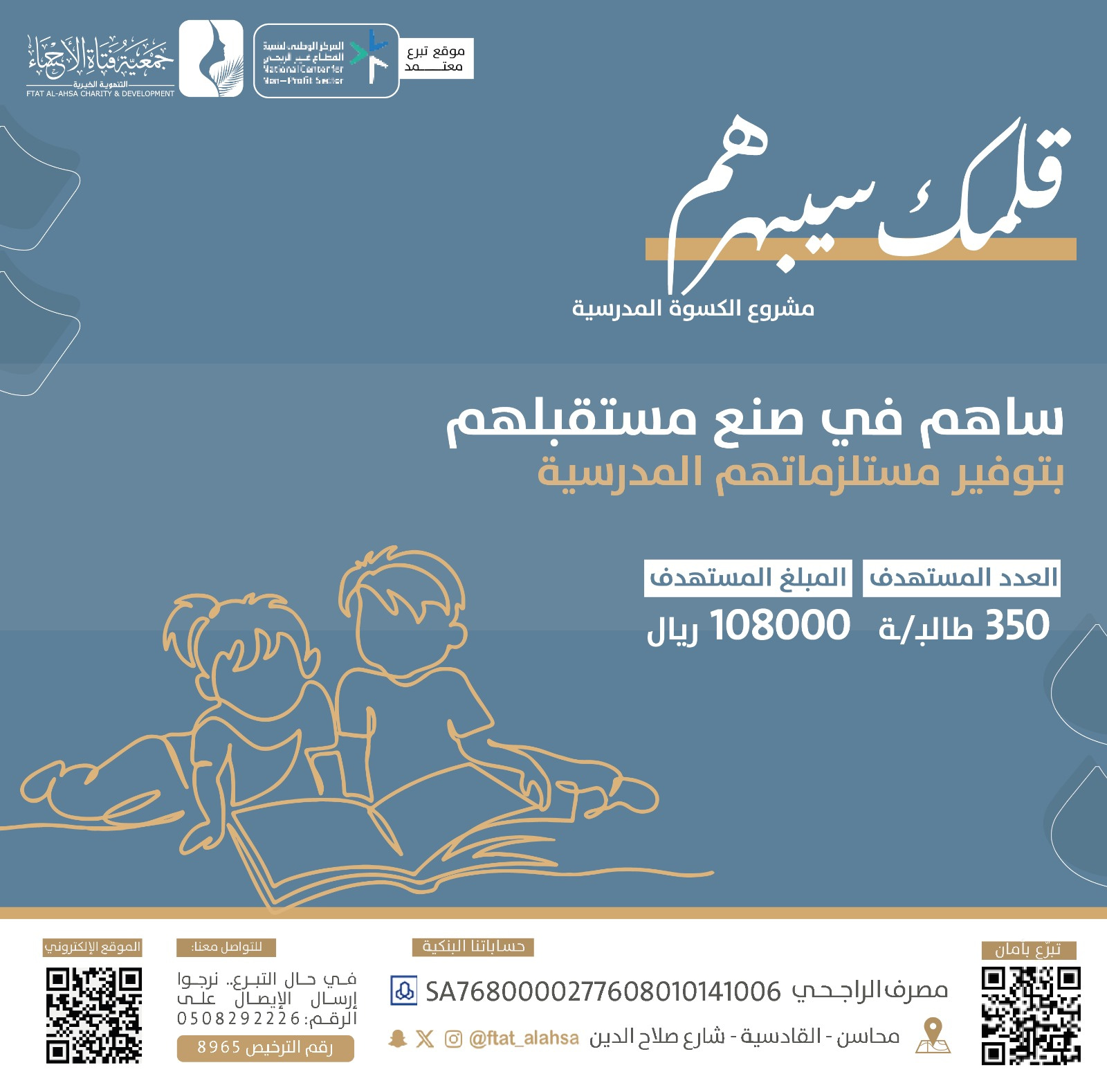 أطلقت جمعية فتاة الأحساء هذا الأسبوع مشروع “قلمك سيبهرهم” لتأمين الحقيبة المدرسية لأبناء الأسر التي ترعاها، حيث تستهدفالجمعية مبلغًا إجماليًا قدره (108,000) ريال لتوفير الحقيبة المدرسية لعدد (350) طالبًا وطالبة. أوضحت ذلك عضو مجلس الإدارةالأستاذة نوره العثمان، حيث سيتم بإذن الله إيداع المبلغ المخصص للحقيبة المدرسية في بطاقات منافذ للأسر لاختيار ما يناسبهم منالمستلزمات المدرسية.