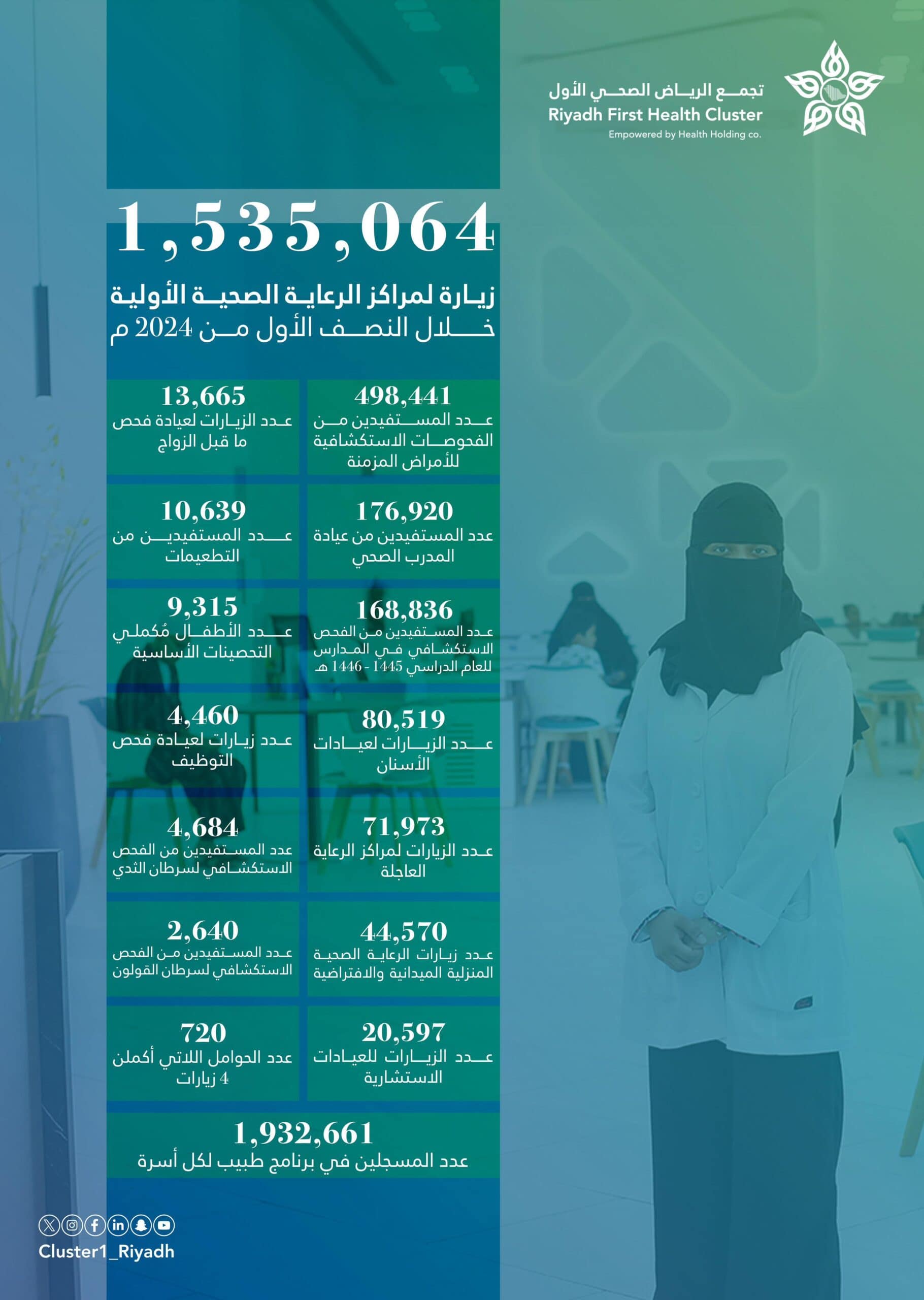 حيث بلغ عدد المستفيدين من الفحوصات الاستكشافية للأمراض المزمنة 498,441 شخصًا، و176,920 زائرًا لعيادة المدرب الصحي، و168,836 مستفيدًا من الفحص الاستكشافي في المدارس خلال العام الدراسي 1445-1446 هـ، فيما بلغت زيارات عيادات الأسنان 80,519 زيارة، و71,973 زيارة لمراكز الرعاية العاجلة، و44,570 زيارة للرعاية الصحية المنزلية الميدانية والافتراضية، و20,597 زيارة للعيادات الاستشارية، و13,665 زيارة لعيادة فحص ما قبل الزواج. بينما بلغ عدد المستفيدين من التطعيمات 10,639 ، وبلغ عدد الأطفال مُكملي التحصينات الأساسية 9,315 طفلًا، فيما بلغت زيارات عيادة فحص التوظيف 4,460 زيارة، ووصل عدد المستفيدين من الفحص الاستكشافي لسرطان الثدي إلى 4,684 حالة، و2,640 حالة للفحص الاستكشافي لسرطان القولون. كما بلغ عدد الحوامل اللاتي أكملن أربع زيارات 720 حاملًا، فيما بلغ عدد المسجلين في برنامج طبيب لكل أسرة 1,932,661.