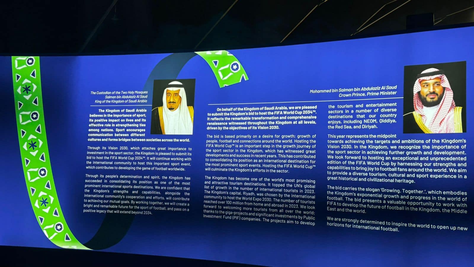 وبين ولي العهد الامير محمد بن سلمان بأنه ملف الترشح يرفع شعار “معاً ينمو ” الذي يجسد ما تعيشه المملكة من نمو مطّرد وتطور في عالم كرة القدم ، ومحققاً لأهدافها في خلق اقتصاد متنوع ومستدام ،