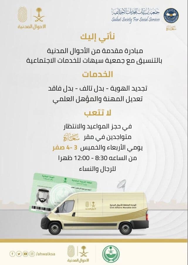 في إطار الجهود الحثيثة لتقديم خدمات أفضل وأكثر سهولة للمواطنين، أطلقت إدارة الأحوال المدنية بالتعاون مع جمعية سيهات للخدمات الاجتماعية المبادرة الثالثة من “نأتي إليك” في النصف الثاني من هذا العام، هذه المبادرة التي تهدف إلى تقديم الخدمات المختلفة للمواطنين في مقر جمعية سيهات للخدمات الاجتماعية.