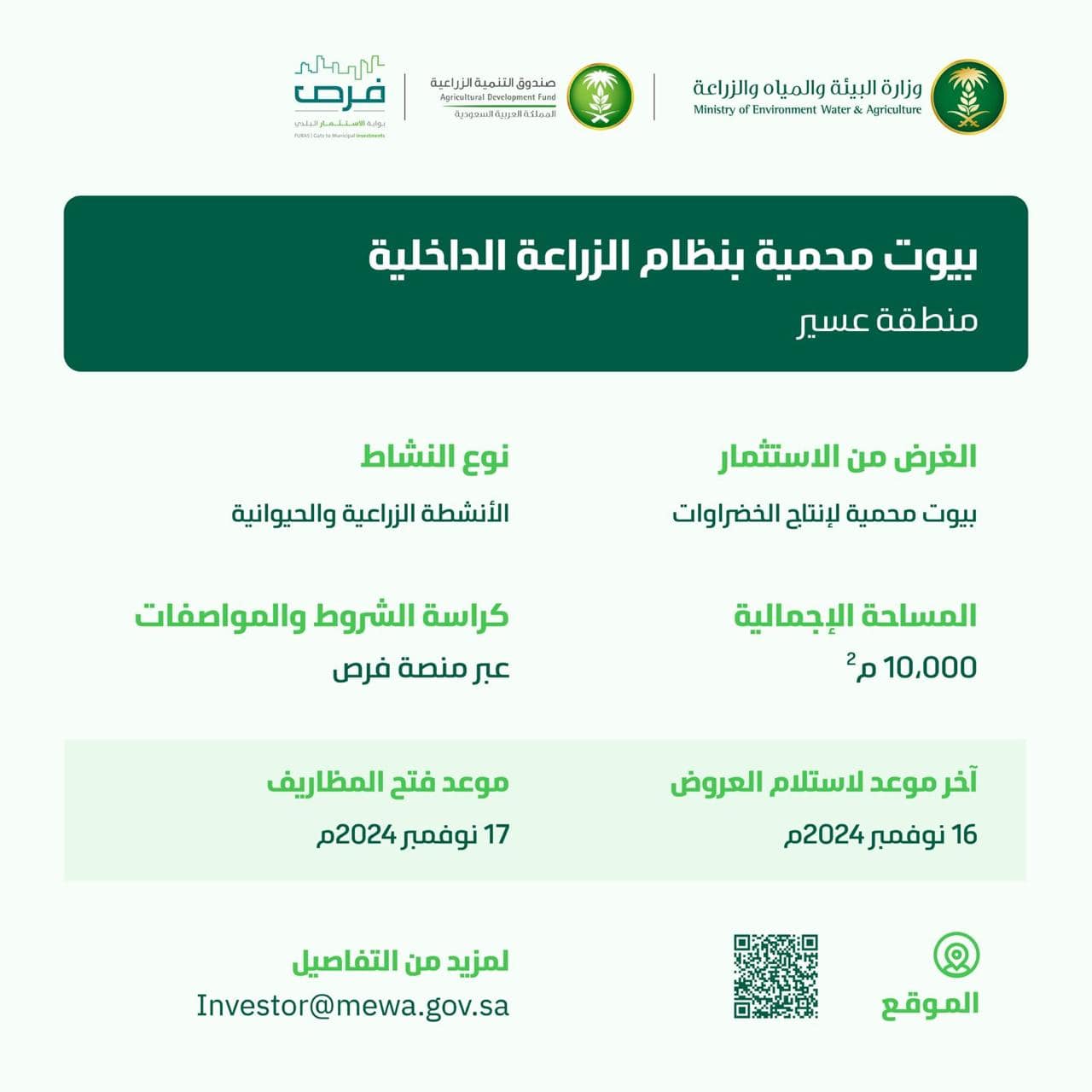 وأوضحت الوزارة أن الفرصة الاستثمارية الأولى تتضمن طرح فرصة واعدة لإنشاء بيوت محمية بنظام الزراعة الداخلية؛ لإنتاج الخضروات في منطقة عسير على مساحة تقدر بـ(10.000م2)، لافتة إلى أن آخر موعد لاستلام العروض 16 نوفمبر 2024م، وفتح المظاريف 17 نوفمبر 2024م.