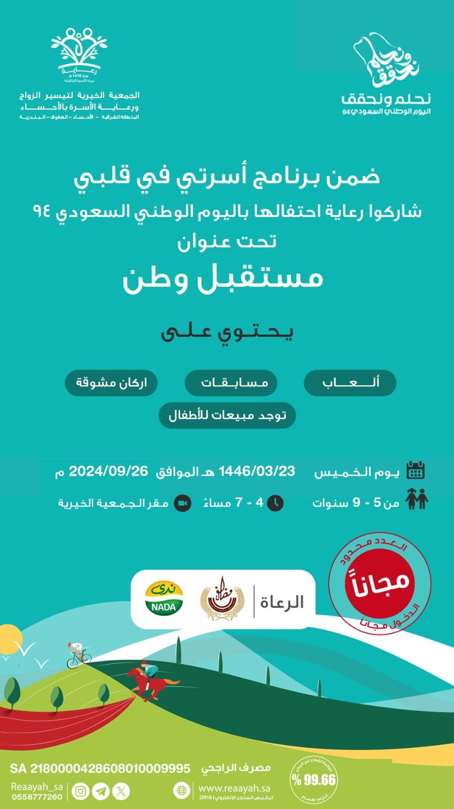 يسر الجمعية الخيرية لتيسير الزواج ورعاية الأسرة بالأحساء دعوتكم للمشاركة في احتفالها باليوم الوطني السعودي الـ94 ضمن برنامجهاالمميز “*أسرتي في قلبي*”، والذي سيُعقد يوم الخميس *26 سبتمبر 2024*، من الساعة *4 مساءً إلى 7 مساءً* ، بمقر الجمعية في*الهفوف – البندرية*.