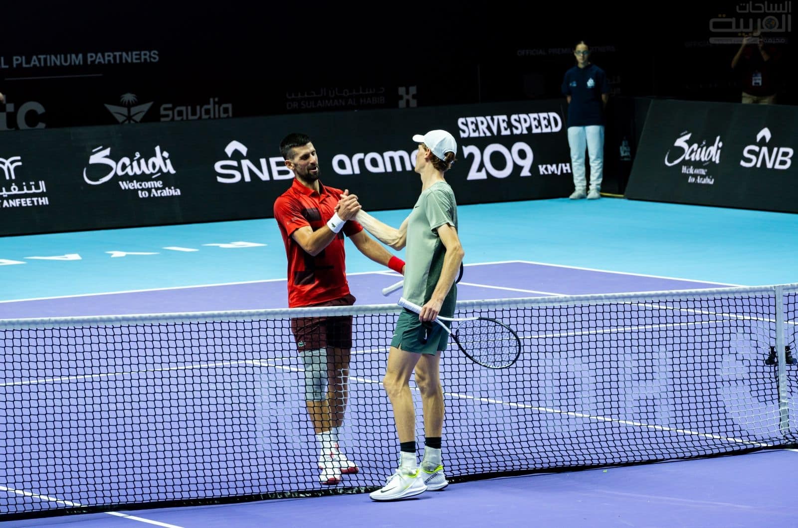 في المباراة الأولى، سيطر التعادل على معظم مجريات اللقاء الذي استمر ساعتين ونصف الساعة. تقدم سينر في المجموعة الأولى بنتيجة 6-2، ثم عاد ديوكوفيتش ليحسم المجموعة الثانية بشوط كسر التعادل 7-6. وفي المجموعة الحاسمة، انتصر الشاب الإيطالي بنتيجة 6-4، بعد مباراة دراماتيكية حبست أنفاس الجماهير التي اكتظت فيهم مقاعد منطقة The Venue إحدى مناطق الموسم الجديدة، ليتأهل إلى النهائي ويُرسل ديوكوفيتش إلى مباراة تحديد المركز الثالث. وجاء هذا الفوز بعد يوم واحد فقط من تغلب سينر على الروسي دانييل مدفيديف ليصل إلى نصف النهائي.