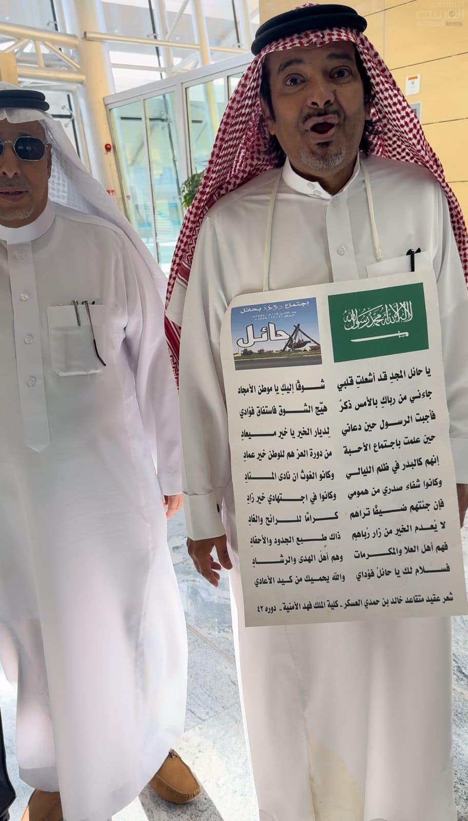 لفت نظر المسافرين في محطة القطار سار في حائل مواطن قادم من الرياض وهو يتقلد قصيدة على صدره من عدة أبيات وتحمل علم السعودية ومنظر من حائل.