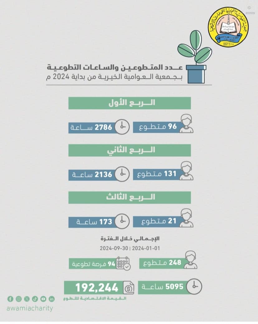 قدّم 248 متطوعًا بجمعية العوامية الخيرية للخدمات الاجتماعية 5095 ساعة تطوعية منذ بداية عام 2024 وحتى نهاية الربع الثالث. تُقدّر القيمة الاقتصادية لهذه الساعات بـ 192,244 ريالًا لـ 94 فرصة تطوعية طرحتها الجمعية.