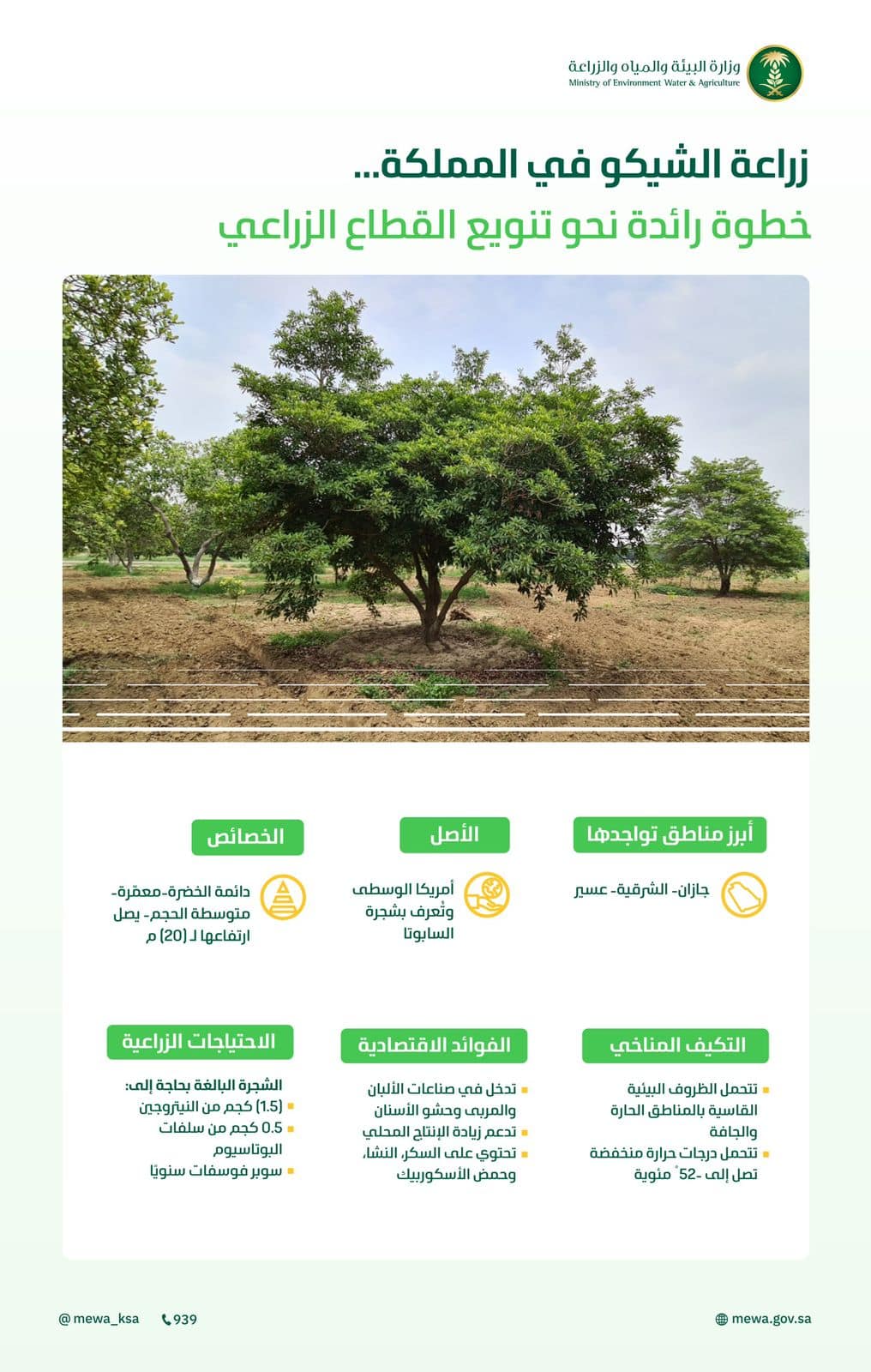 وأضافت الوزارة أن نجاح زراعة أشجار الشيكو في مناطق متعددة من المملكة يُظهر الإمكانيات الكبيرة لهذا النوع من الزراعات في تحقيق الاكتفاء الذاتي والمساهمة في دعم الاقتصاد المحلي، مشيرة إلى أن هذه الأشجار ليست فقط مفيدة من الناحية الاقتصادية، بل تُعزز أيضًا التنوع الزراعي وتحافظ على الاستدامة البيئية بالمملكة.