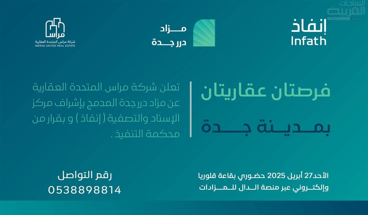 تعلن شركة مراس المتحدة العقارية وبإشراف مركز الإسناد والتصفية «إنفاذ» وبقرار من محكمة التنفيذ ، عن إقامة مزاد ” مزاد درر جدة” الكتروني عبر منصة الدال للمزادات، وحضوري يوم الأحد 27 / 4 / 2025 م الموافق 29 / 10 / 1446 هـــ ً بقاعة قلوريا بجدة الساعة 4:00 مساء