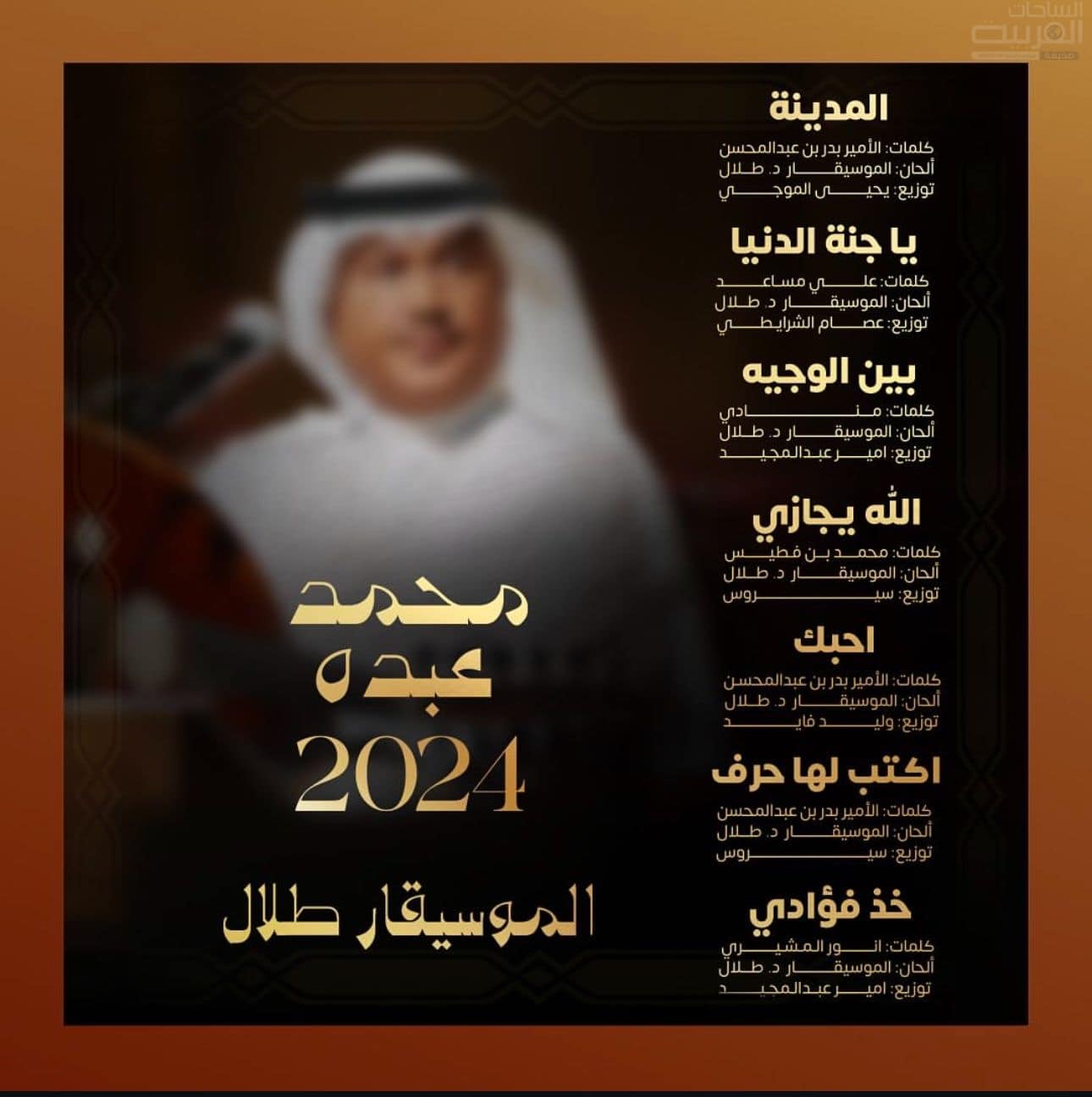 ويتضمن البوم “محمد عبده2024” ايضا تعاونات مع الشعراء: علي مساعد في اغنية “يا جنة الدنيا”، ومنادي في اغنية “بين الوجيه”، ومحمد بن فطيس في اغنية “الله يجازي”، وانور المشيري في اغنية “خذ فؤادي”.