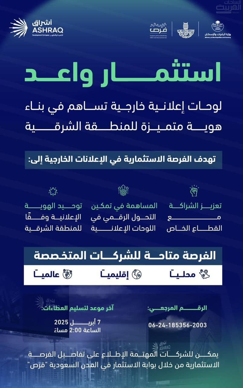 أعلنت شركة أشراق للتنمية والتطوير، الذراع التنموي لأمانة المنطقة الشرقية، عن طرح فرصة استثمارية في مجال الإعلانات الخارجية على الأصول البلدية في حاضرة الدمام كجزء من استراتيجية تطوير الإعلانات الخارجية داخل المدن السعودية والمعدة من قبل وزارة البلديات والإسكان والمعتمدة من قبل مجلس الوزراء تحقيقًا لمستهدفات رؤية المملكة 2030، حيث تتضمن الاستراتيجية أن يكون لكل مدينة مخطط إعلاني يتناسب مع هويتها واقتصادياتها.