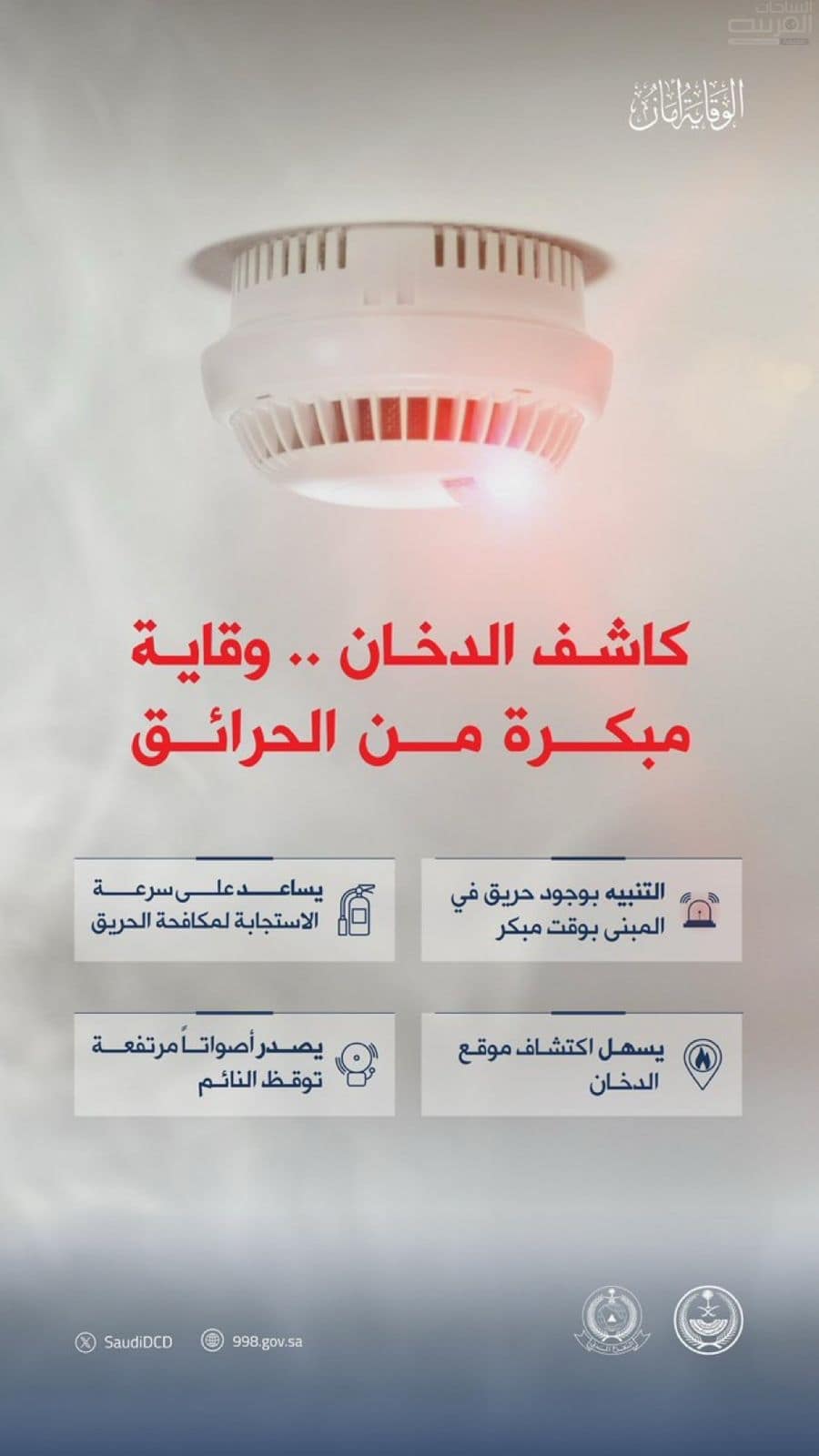 أكدت المديرية العامة للدفاع المدني، أهمية اقتناء كاشف الدخان، ودوره في حماية الإنسان والمحافظة على الممتلكات، لتفادي وقوع الخسائر وتعجيل عمليات الإخلاء.