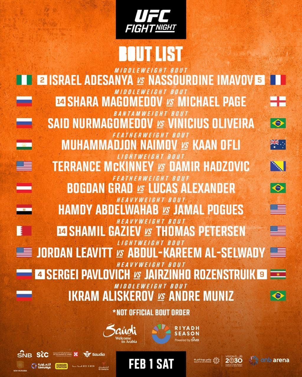 أعلنت الهيئة العامة للترفيه (GEA) اليوم، عن القائمة الكاملة للمقاتلين المشاركين في الحدث المرتقب، التي تُنظم بالتعاون مع منظمة الفنون القتالية المختلطة الأولى عالميًا UFC، وستُقام في anb أرينا بالعاصمة الرياض في 1 فبراير، وتضم نخبة من أفضل الرياضيين من جميع أنحاء العالم.
