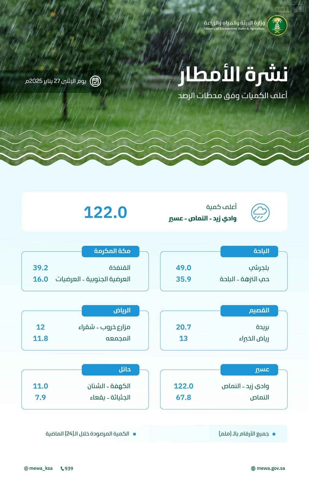 وفقًا للتقرير اليومي الصادر عن وزارة البيئة والمياه والزراعة، شمل التقرير هطول الأمطار عبر (140) محطة هيدرولوجية ومناخية، وذلك خلال الفترة من الساعة التاسعة صباح يوم الأحد 26 يناير حتى الساعة التاسعة صباح يوم الاثنين 27 يناير 2025م في (9) مناطق بالمملكة هي (الرياض- مكة المكرمة- المدينة المنورة- القصيم- الشرقية- عسير- حائل- نجران- الباحة)