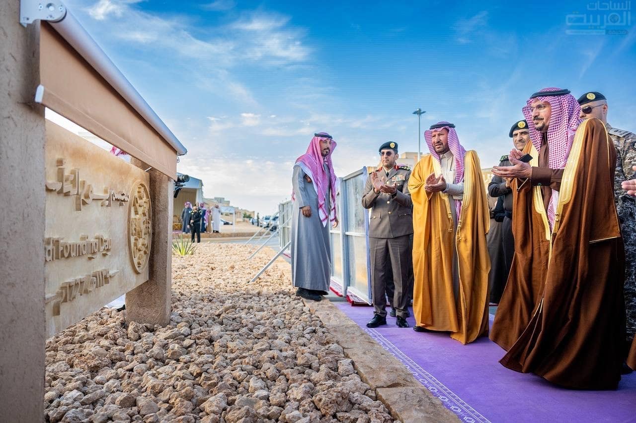 دشّن صاحب السمو الملكي الأمير الدكتور فيصل بن مشعل بن سعود بن عبد العزيز أمير منطقة القصيم، اليوم السبت 22 فبراير 2025م، مجسم يوم التأسيس، وذلك تزامناً مع الاحتفاء بيوم التأسيس السعودي، وسط أجواء وطنية مميزة شهدت أداء العرضة السعودية، التي عكست روح الفخر والانتماء لتاريخ المملكة العريق ، واستمع أمير القصيم الى شرح موجز من أمين القصيم المهندس محمد بن مبارك المجلي ، عن المجسم حيث يستمد المجسم إلهامه من عراقة الدرعية، القلب النابض لتاريخ المملكة العربية السعودية، ويجسد بتفاصيله روح التراث النجدي الأصيل، وقد تم تشكيل المباني بشكل متناغم مع واقع الدرعية و مبانيها الطينية، مما يعكس دقة المحاكاة للعمارة التقليدية التي تتميز بها المنطقة، من خلال الزخارف الدقيقة والأشكال الهندسية المتناسقة، ويعكس التصميم روعة التراث المعماري، معبّرًا عن عمق الجذور الثقافية وارتباطها الوثيق بهوية المملكة، وبوقوعه على طريق التأسيس في مدينة بريدة، يُصبح المجسم رمزاً حياً يربط بين الماضي العريق والحاضر المشرق، كما يمتد المجسم على مساحة 265 م2، ويتفاوت ارتفاع المجسم بين متر إلى خمسة أمتار، هذا العمل ليس مجرد تجسيد معماري، بل احتفاءٌ بتراث عريق ورمزية تاريخية تروي قصة الانطلاقة الأولى لدولة عظيمة، وتجسد قيم التأسيس والوحدة التي قامت عليها المملكة.