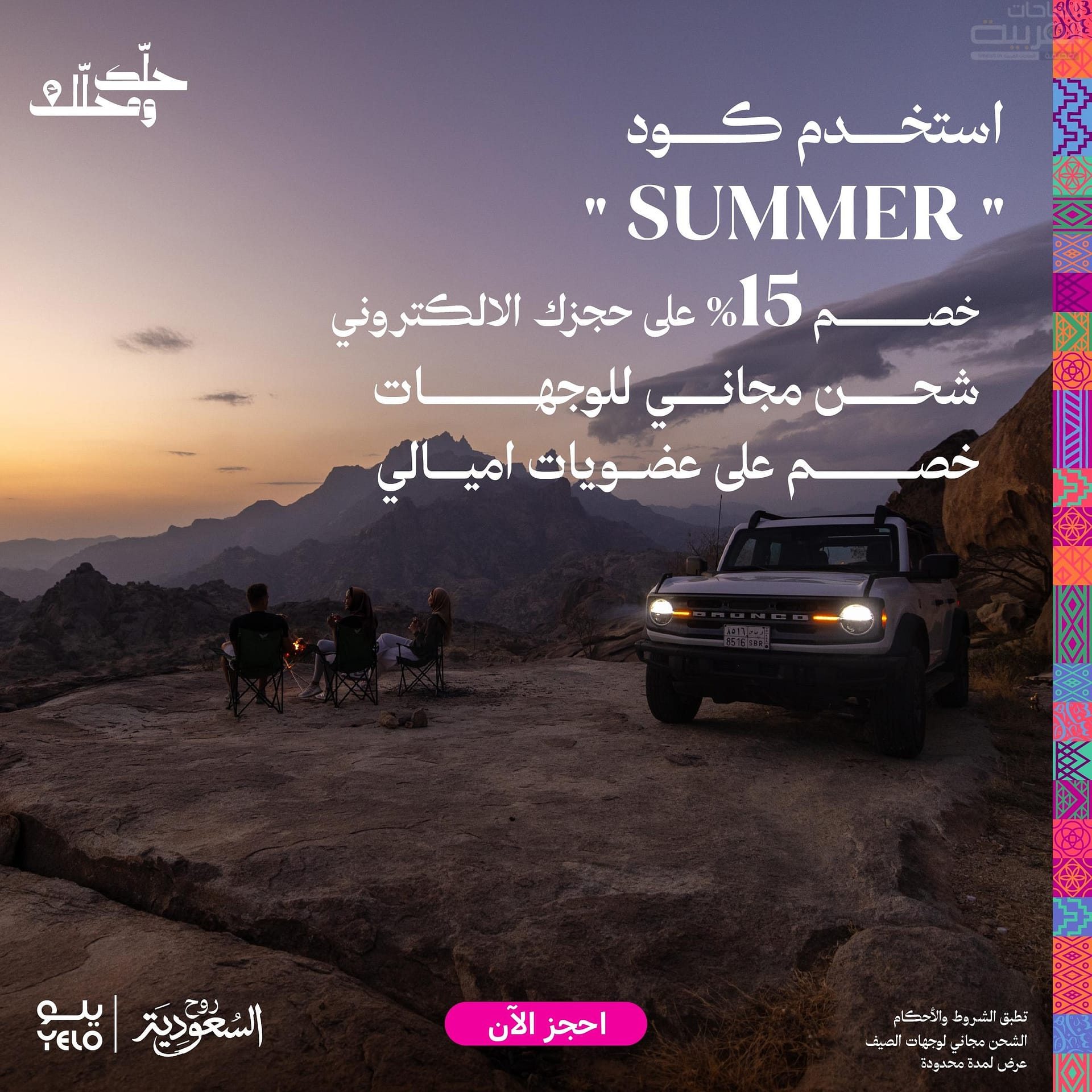 وأكد الرئيس التنفيذي لشركة الوفاق لحلول النقل “يلو” الأستاذ حمد الحميّد بأن “يلو” تحرص دائماً على تقديم أفضل الخيارات أمام عملائها خلال المواسم السياحية التي تشهدها المملكة ومن ضمنها موسم الصيف الذي تحرص خلاله العائلات على قضاء إجازاتها السنوية في مناطق المملكة السياحية الرائعة والتي تطوّرت كثيراً بفضل رؤية السعودية 2030 التي أولت الجانب السياحي اهتماماً كبيراً، وأضاف الحميّد قائلاً: تم تصميم حملة “يلو” لصيف هذا العام بناءً على اقتراحات عملائنا الكرام، حيث إن التنقل بين المدن يعدّ من الأنشطة المرتبطة بالسياحة الداخلية لأنها تعطي فرصة أكبر لزيارة أكثر من موقع سياحي؛ لذلك تم توفير خيار الشحن المجاني للمركبات بين المدن السياحية الرئيسية، مما يعطي ميزة رائعة للعملاء، كما تم تقديم خصم إضافي لأعضاء برنامج أميالي تعبيراً عن تقدير الشركة لولائهم وثقتهم في “يلو”، وندعو جميع العملاء للتسجيل في برنامج أميالي والاستفادة من المميزات والمفاجآت التي يقدمها لأعضائه.