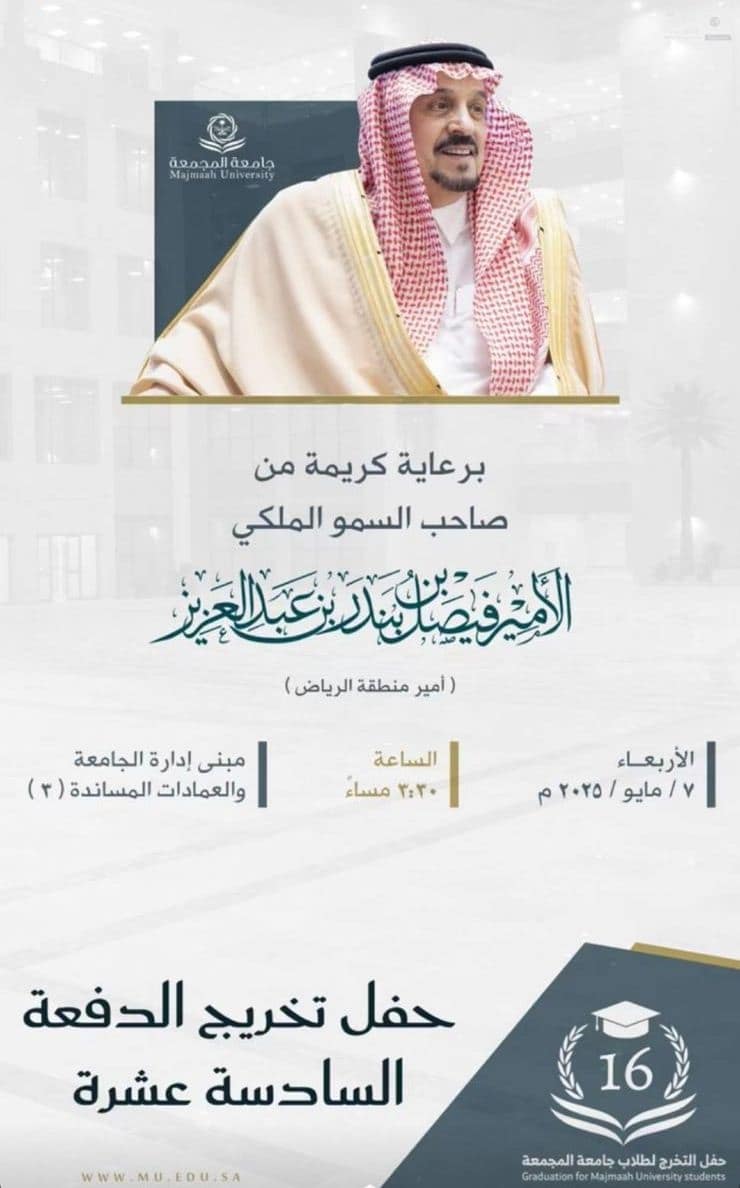 يرعى صاحب السمو الملكي الأمير فيصل بن بندر بن عبد العزيز آل سعود – أمير منطقة الرياض – احتفال جامعة المجمعة بتخريج الدفعة السادسة عشرة من طلابها لمرحلة البكالوريوس ، وطلابها من حملة الماجستير ، وطلاب برامج الدبلوم العالي ، وتدشين عدد من مشاريعها ، وذلك مساء يوم الأربعاء الموافق 9 / 11 / 1446هـ في البهو الرئيسي بمبنى إدارة الجامعة والعمادات المساندة بالمدينة الجامعية بالمجمعة ، وتأتي رعاية سموه لهذا الحفل امتداداً لرعايته ودعمه للعديد من نشاطات وفعاليات الجامعة .