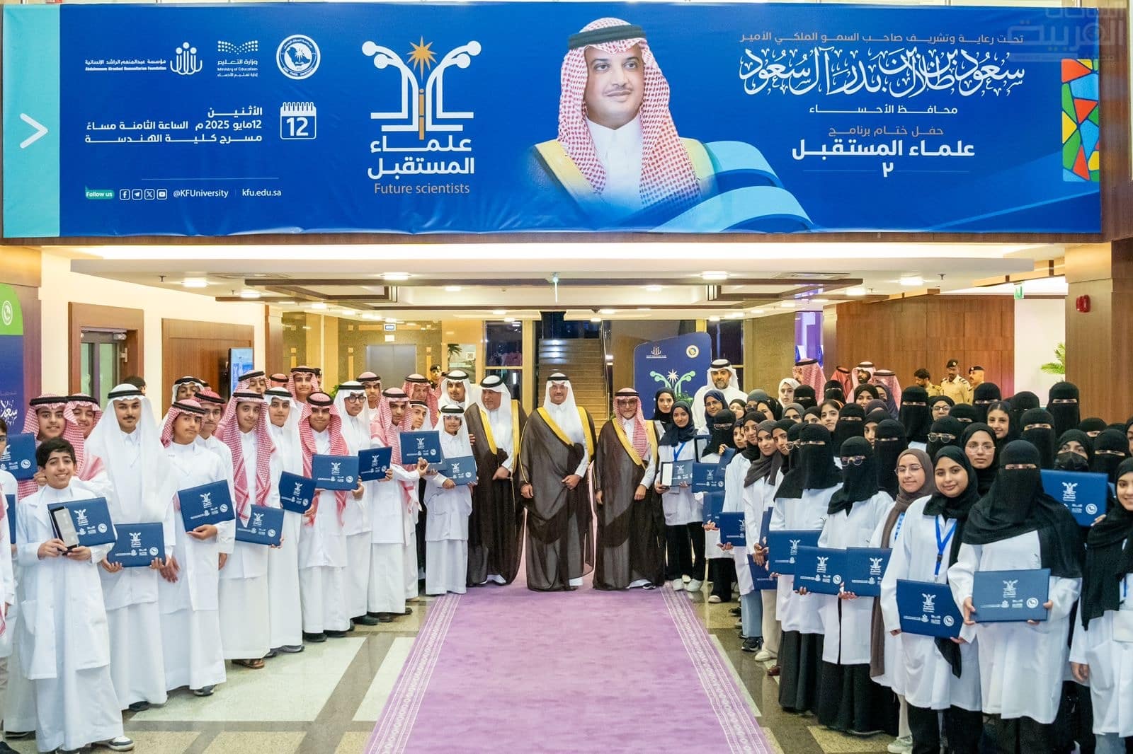 رعى صاحب السمو الملكي الأمير سعود بن طلال بن بدر محافظ الأحساء ، مساء أمس “ الاثنين “ ، حفلختام النسخة الثانية من برنامج “علماء المستقبل”، الذي تنظمه جامعة الملك فيصل ممثلة في إدارةتطوير الشراكة المجتمعية والمركز الوطني لأبحاث الموهبة والإبداع، بالشراكة مع مؤسسة عبد المنعمالراشد الإنسانية، وبدعم من الإدارة العامة للتعليم بمحافظة الأحساء، وذلك على مسرح كلية الهندسة.