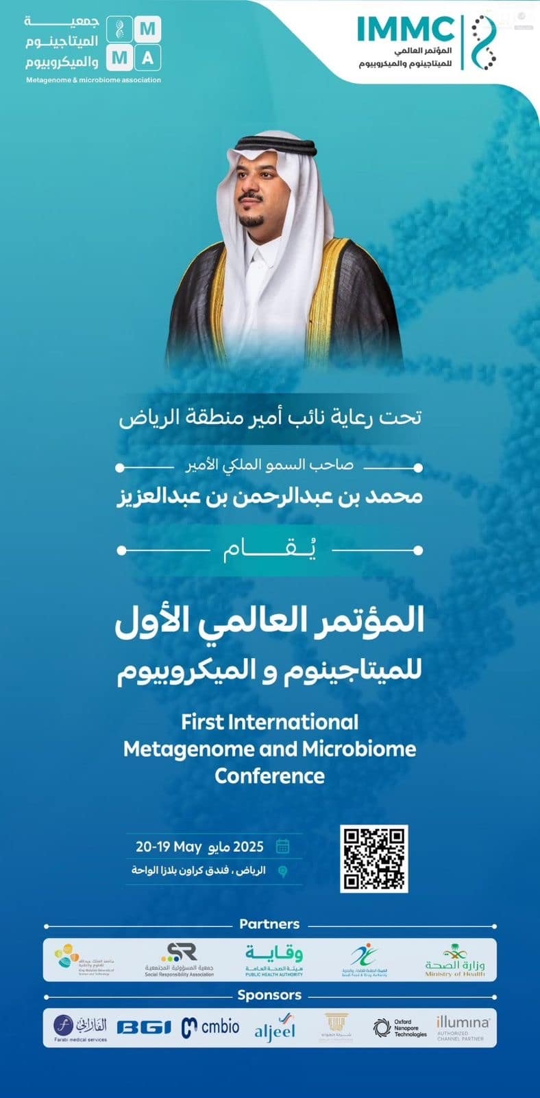 تنطلق صباح غدٍ الإثنين في العاصمة الرياض فعاليات المؤتمر العالمي الأول للميتابيوموالميكروبيوم، برعاية كريمة من صاحب السمو الملكي الأمير محمد بن عبدالرحمن بنعبدالعزيز آل سعود، نائب أمير منطقة الرياض.