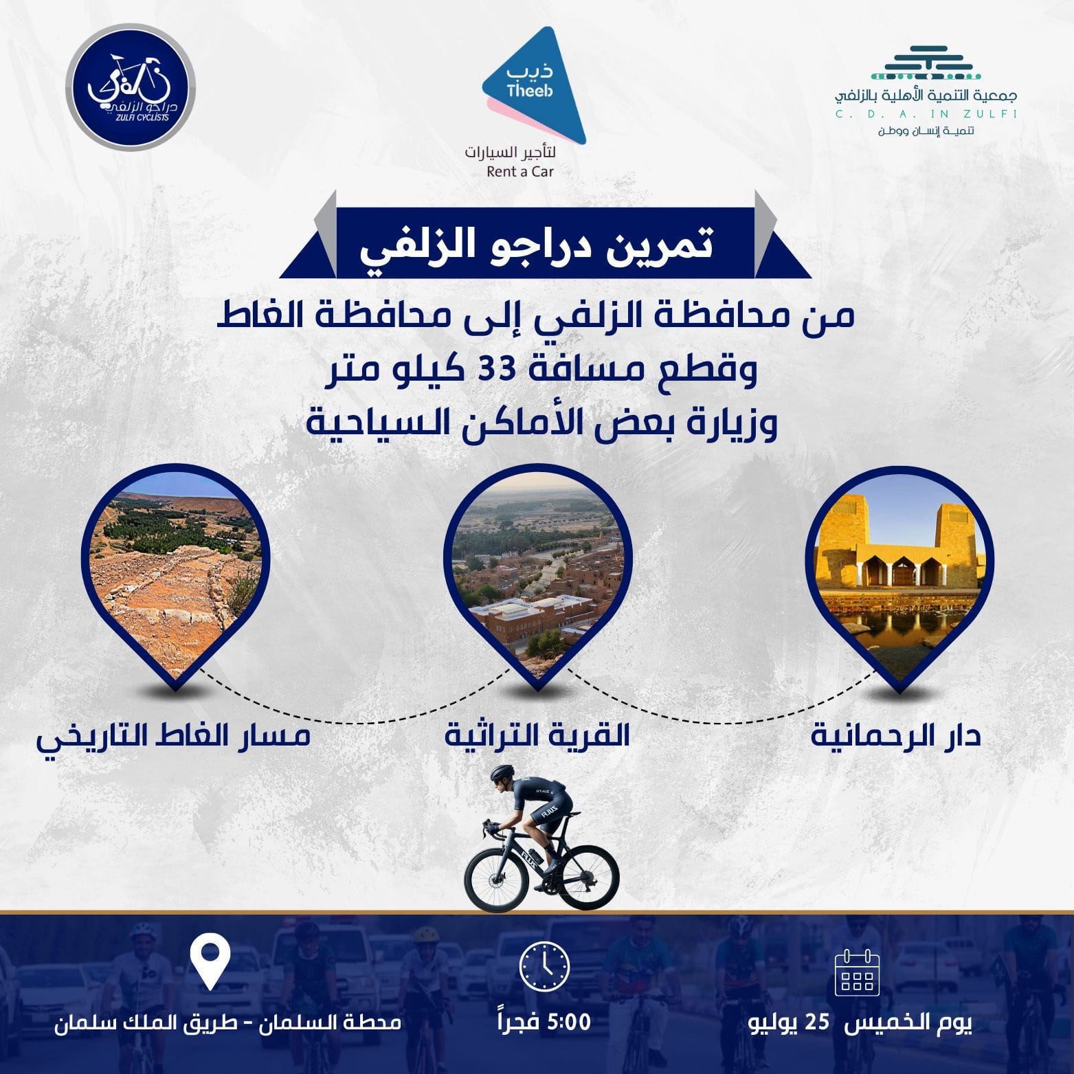 برعاية ذيب لتأجير السيارات وتحت مظلة جمعية التنمية الاجتماعية الأهلية بالزلفي ينظم فريق دراجو الزلفي برنامج رقم (4) لعام 2024م (زيارة محافظة الغاط 🚲) ينطلق الدراجين فجر الخميس 25 يوليو 2024م من محافظة الزلفي إلى محافظة الغاط عبر الدرجات الهوائية لزيارة :-