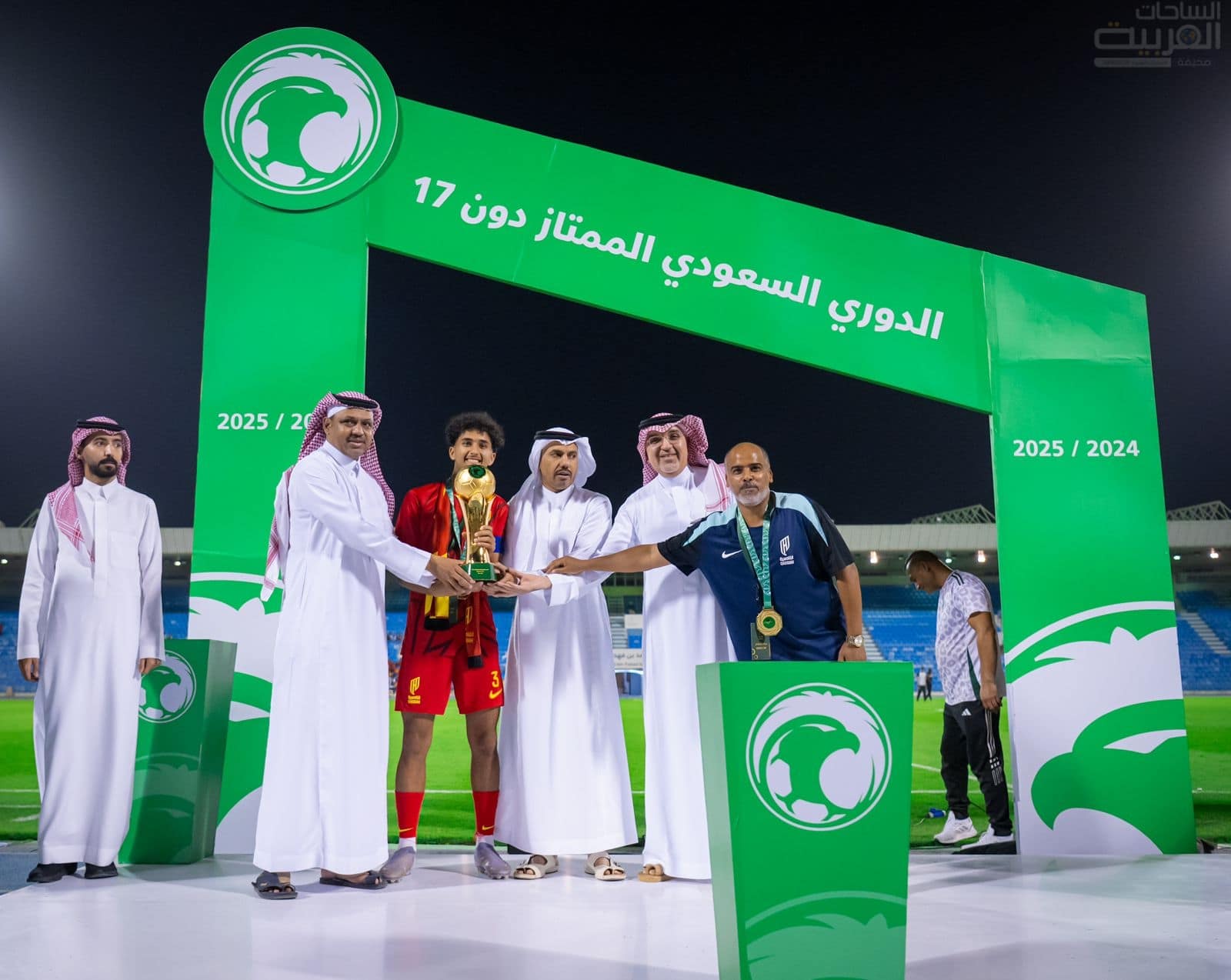 توج عضو مجلس إدارة الاتحاد السعودي لكرة القدم نعيم البكر، السبت، فريق القادسية بكأس الدوري السعودي الممتاز تحت 17 عامًا للموسم الرياضي 2024-2025. وجاء حسم القادسية للدوري بعد فوزه على فريق الباطن 4-1 في المباراة التي جمعت بينهما لحساب الجولة 35 على ملعب مدينة الأمير سعود بن جلوي الرياضية بالخبر. وجاء تتويج القادسية بعد مباراته التي جرت مساء السبت أمام هجر ضمن الجولة الـ 37 ماقبل الأخيرة على استاد الأمير محمد بن فهد بالدمام وحسمها صاحب الأرض بالفوز بنتيجة 6-0. يعتلي القادسية صدارة الدوري برصيد 88 نقطة قبل جولة من ختام المسابقة، فيما يحل النصر ثانيًا برصيد 75 نقطة، وجاء الهلال بالمركز الثالث برصيد 67 نقطة