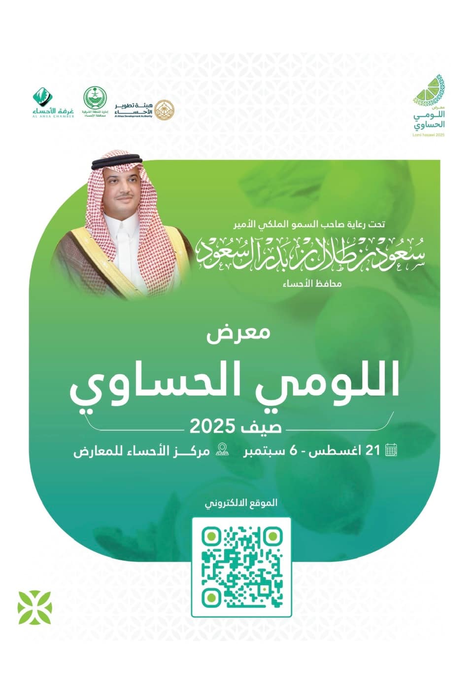 انطلاقاً من دعم واهتمام صاحب السمو الملكي الأمير سعود بن طلال بن بدر محافظ الأحساء بالتنمية الزراعية في الأحساء ، وامتداداً لمبادرة الغرفة الاستراتيجية “تمكين القطاع الخاص” وتعزيزاً لميز الأحساء النسبية الداعمة للقطاع الزراعي والصناعة التحويلية، تنظم غرفة الأحساء معرضاً زراعياً لأحد أبرز المحاصيل المحلية “اللومي الحساوي” وذلك خلال الفترة من 21 أغسطس إلى 6 سبتمبر 2025م.