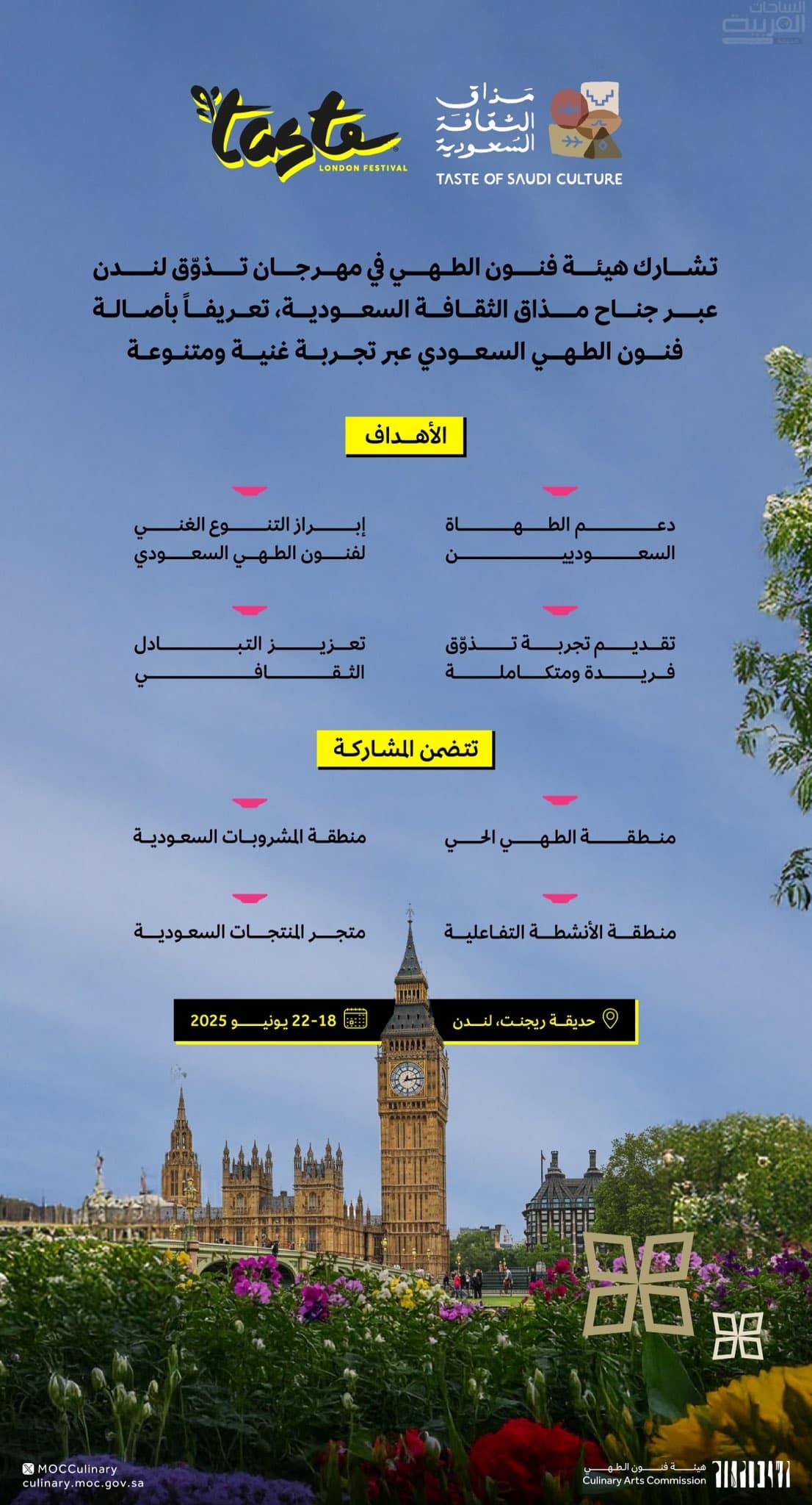 تُشارك هيئة فنون الطهي في معرض تذوّق لندن للمرة الثالثة على التوالي، الذي يقام خلال الفترة من 18 حتى 22 يونيو 2025، في عاصمة المملكة المتحدة لندن بحديقة ريجينت، من خلال جناح “مذاق الثقافة السعودية”؛ وذلك بهدف تسليط الضوء على ثقافة وأصالة فنون الطهي في المملكة العربية السعودية، إلى جانب تعزيز التبادل الثقافي وتقديم المملكة كمركز للثقافة والمذاق.