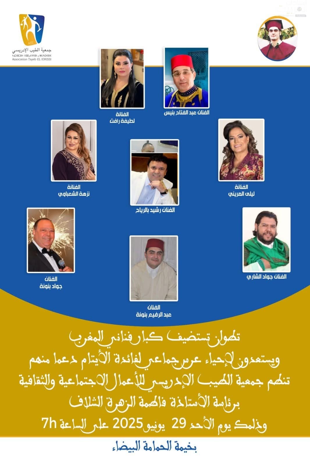 وقالت فاطمة الزهراء الشلاف رئيسة جمعية الطيب الإدريسي للأعمال الاجتماعية والثقافية : ان الملتقى سيشهد حفل فني كبير للعرس الخيري الجماعي لمجموعة من الأيتام ، يحييه مجموعة من عمالقة الفن في المغرب مثل الفنان الكبير المتميز عبد الهادي بنيس ، والفنانة القديرة ليلى المريني ، والفنان جواد الشاري ،